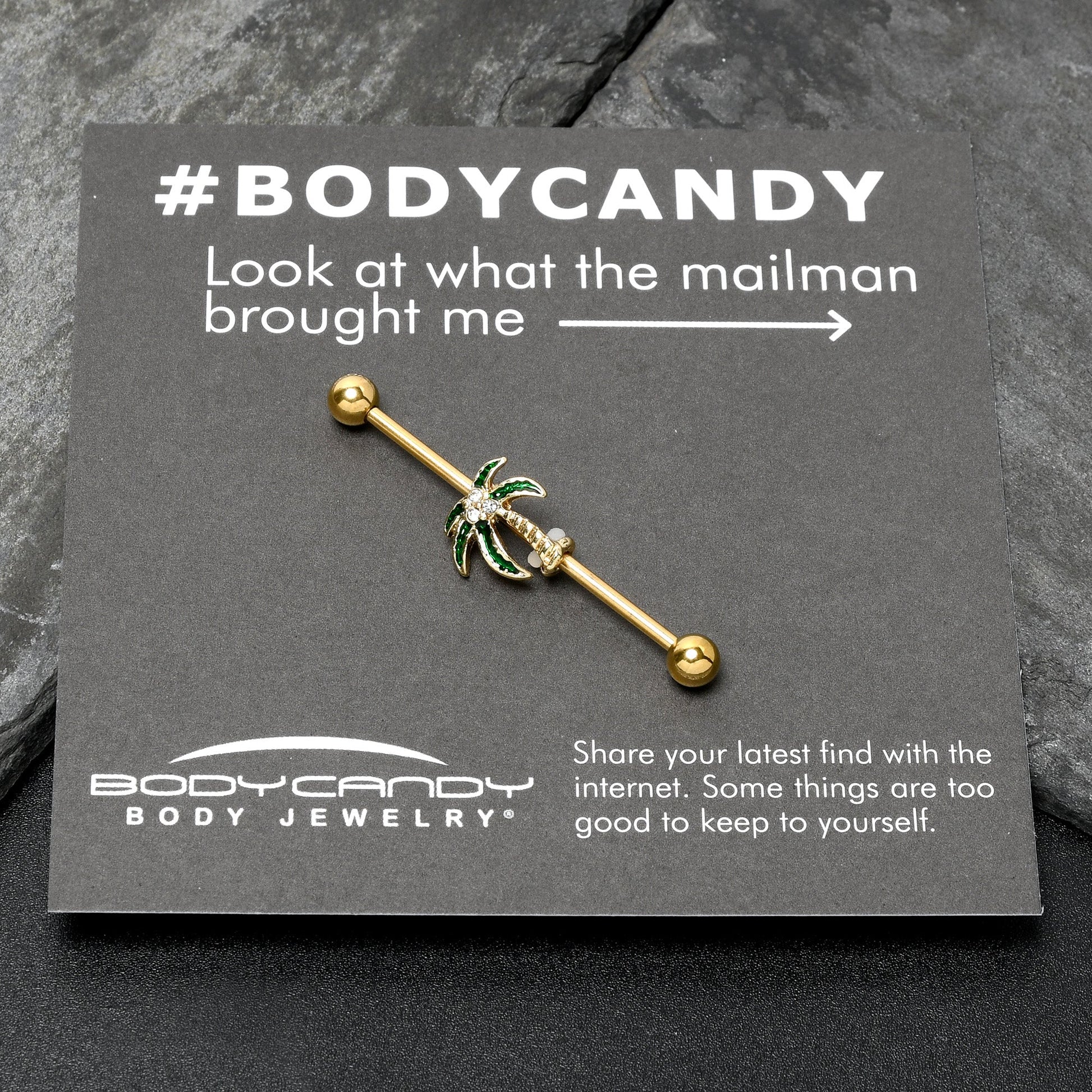 14 Gauge Clear Gem Gold Tone Palm Tree Style Industrial Barbell 38mm