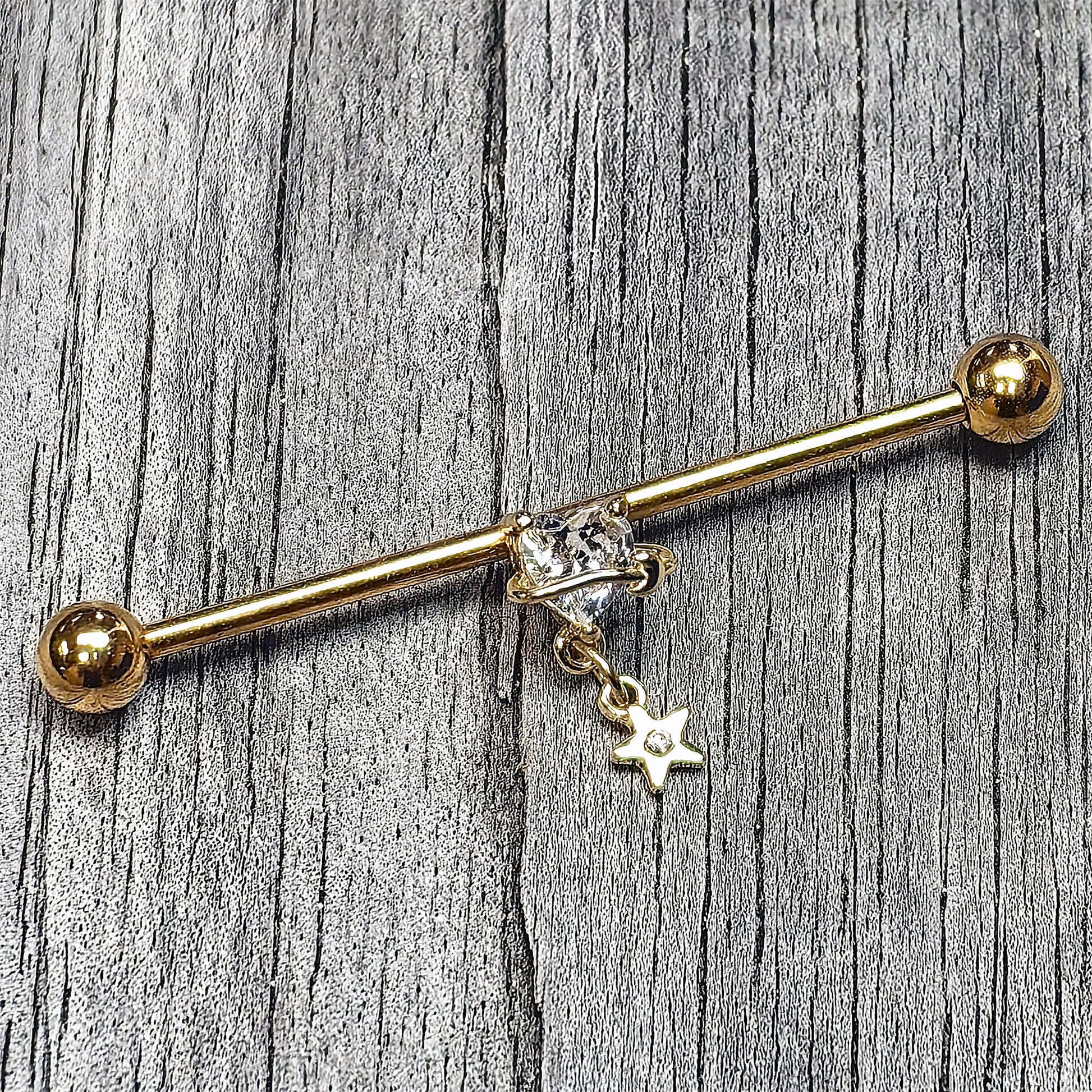 14 Gauge Clear Gem Gold Tone Starry Saturn Dangle Industrial Barbell 38mm