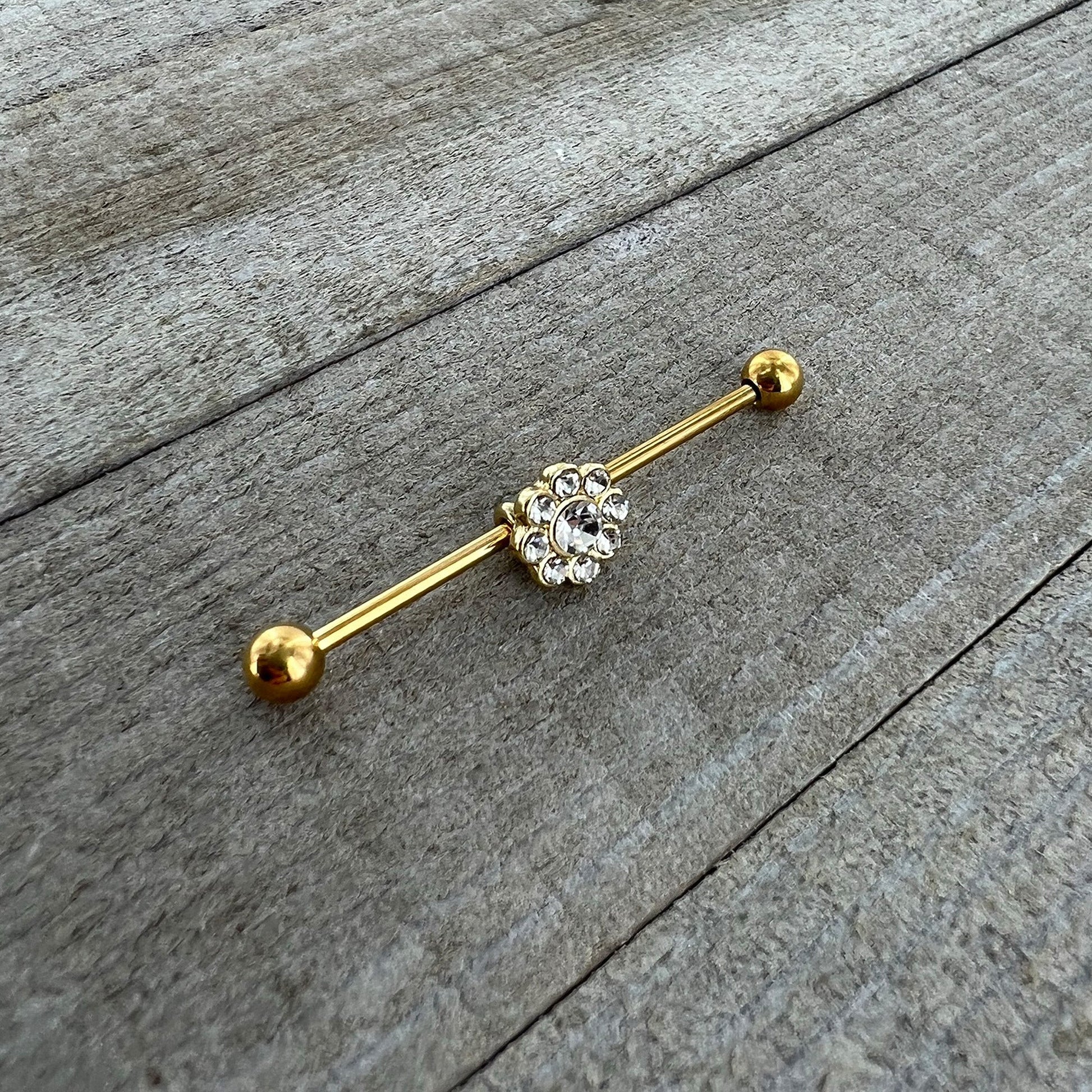 14 Gauge Clear Gem Gold Tone Whimsy Flower Industrial Barbell 38mm