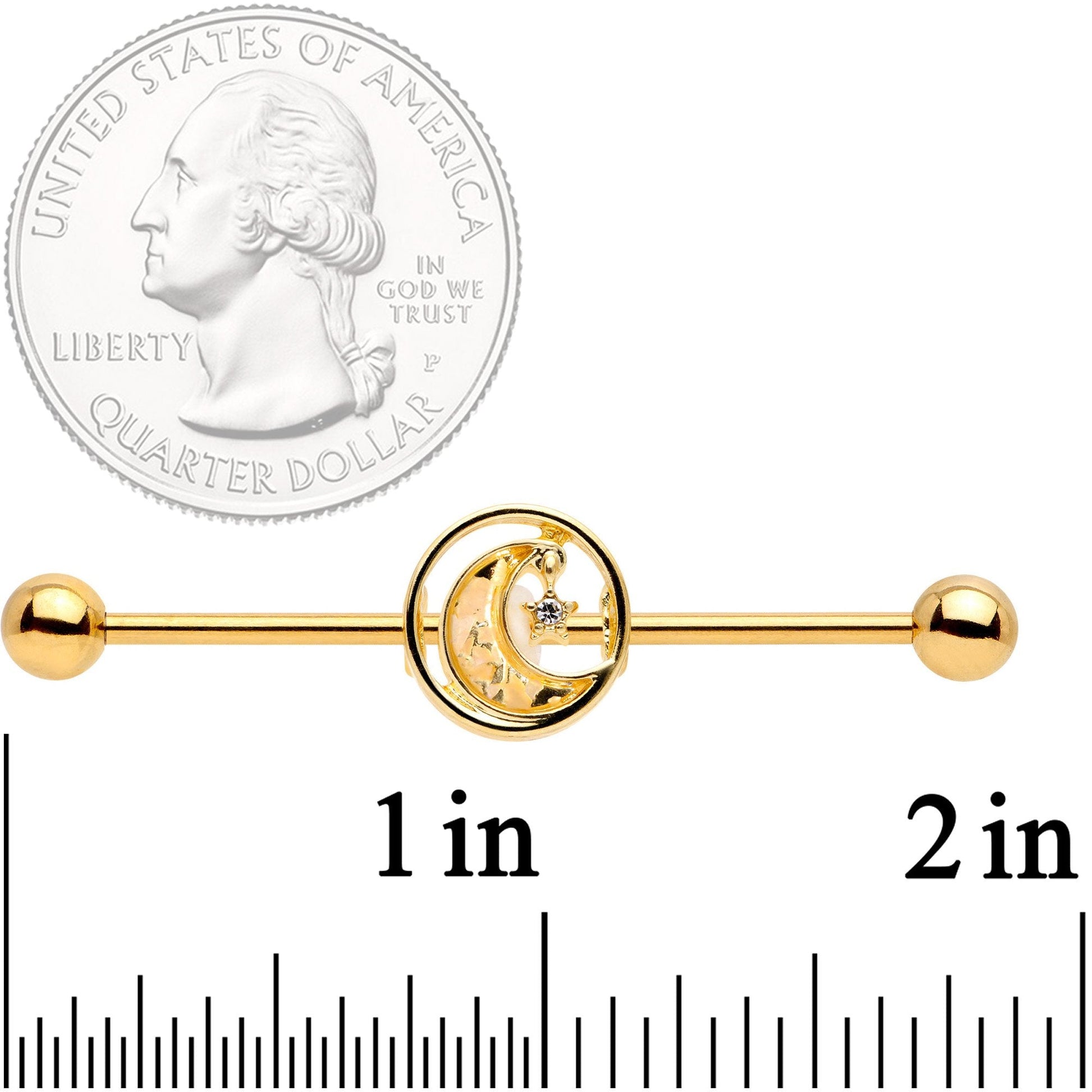 This 14 gauge industrial piercing has a circular charm with a celestial moon inside! The 1 1/2" industrial earring is made with a gold tone PVD over 316L surgical grade stainless steel straight barbell and has 5mm ball ends. Inside the charm is a crescent moon, with an iridescent shell-inspired finish. Set at the top point of the moon is a tiny star, set with a clear gem for a look that truly captures the evening sky. And like the moon travels through the sky, the charm can be slid up and down the length of the barbell so you get just the look you want. Now that's one mighty moon!Specifications