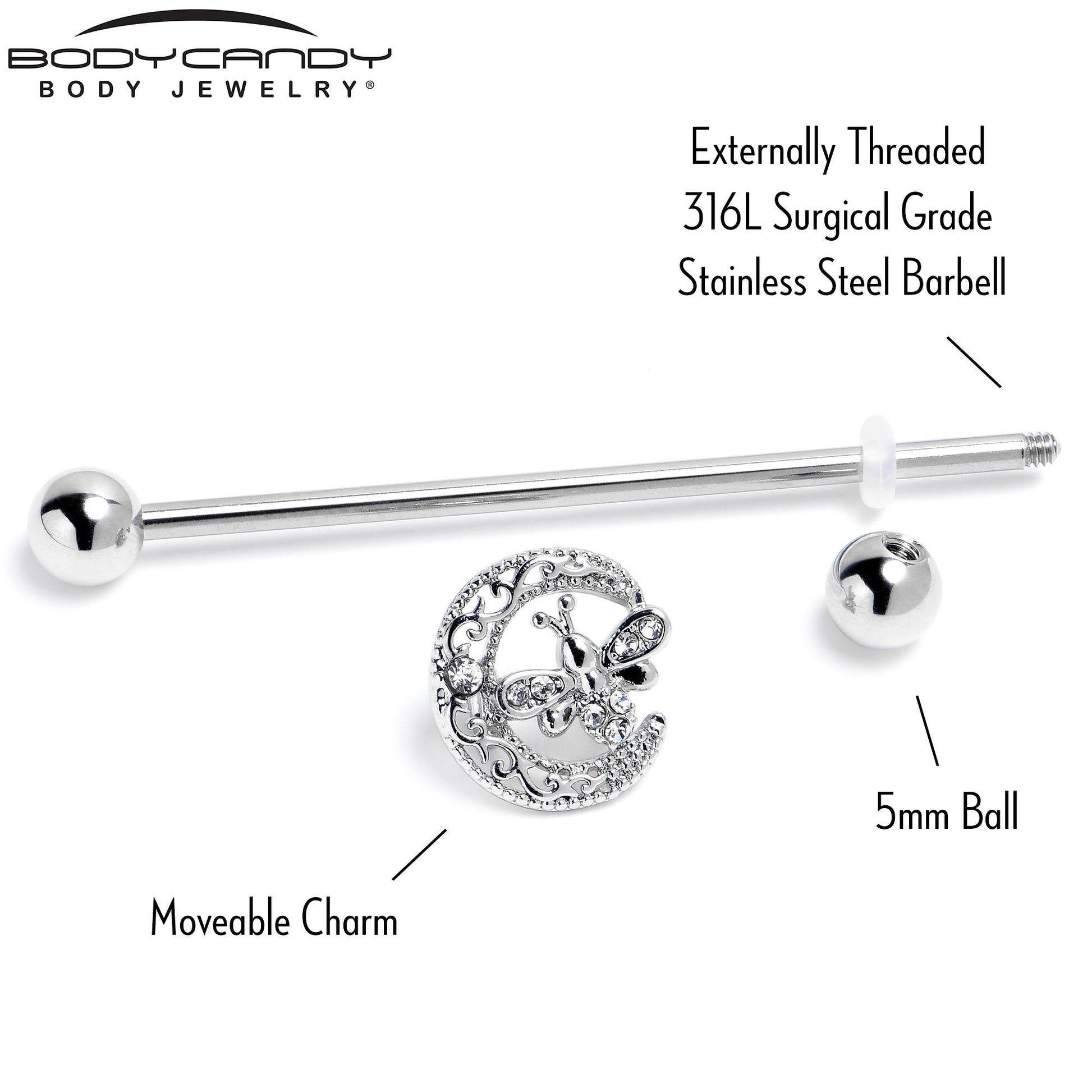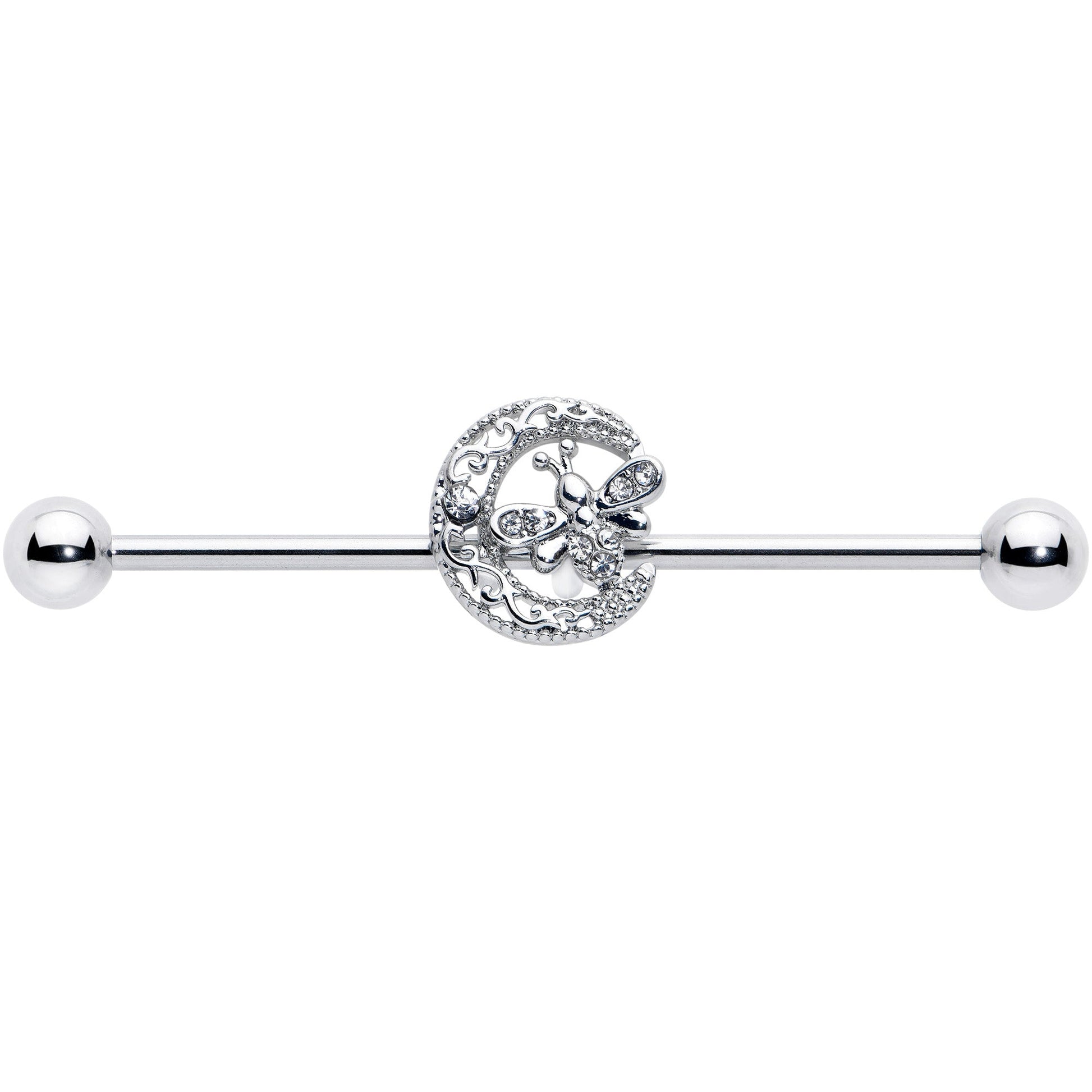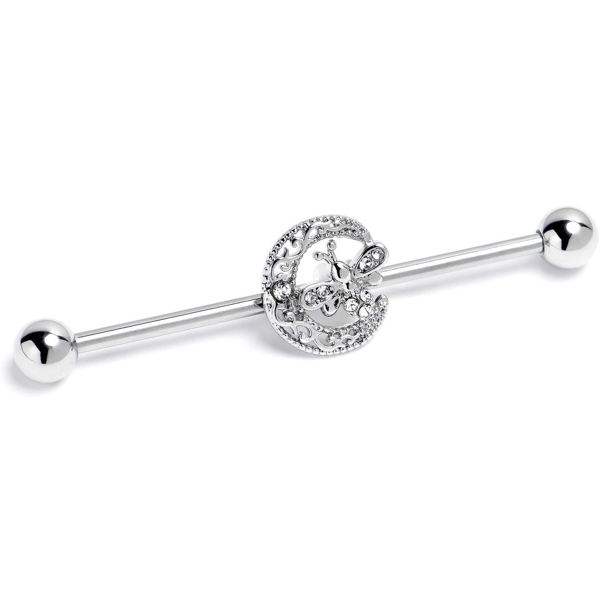 This crescent moon may be alone in the sky but it's got a friend on this 14 gauge helix barbell. It is made with a 1 1/2 inch 316L surgical grade stainless steel straight barbell with 5mm ball ends. It features a crescent moon charm, embellished with filigree detailing giving it an airy appearance as well as a clear gem embellishment. Set between the points of the moon is a dragonfly charm, with clear gems in the wings and body and you can even slide it up and down the length of the barbell for the perfect look. You'll want this barbell earring to keep you company forever.Specifications