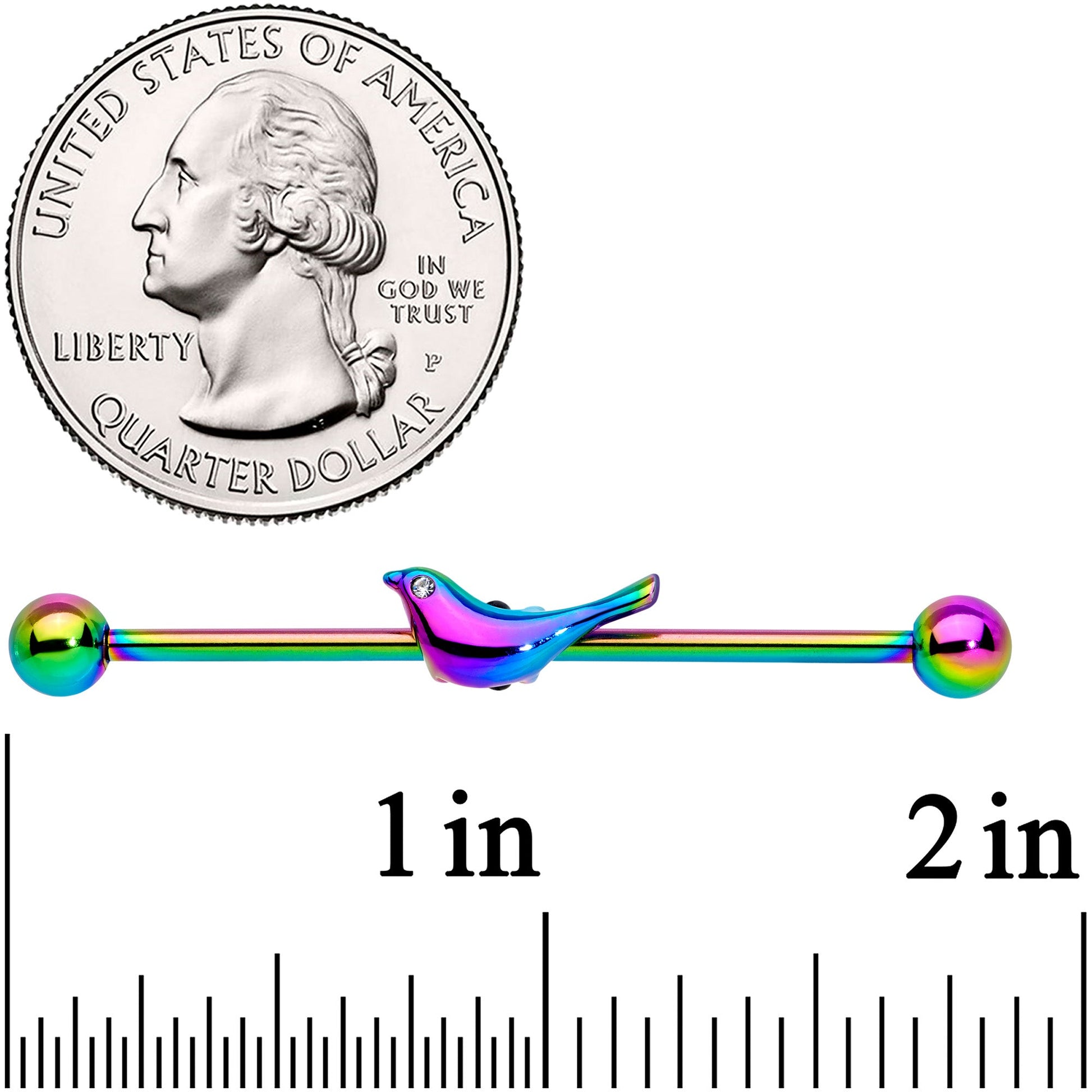 There's no way you can feel gloomy when you have this 14 gauge helix barbell in your industrial piercing! It's made with a 1 1/2" rainbow PVD over 316L surgical grade stainless steel straight barbell with 5mm ball ends. Perched upon the barbell is a matching rainbow color bird charm. The bird features a clear gem eye and sleek, modern lines. And you can slide the bird up and down the length of the barbell to get just the look you're after. You'll be singing a happy tune with this classy and colorful bird barbell earring nesting in your ear!Specifications