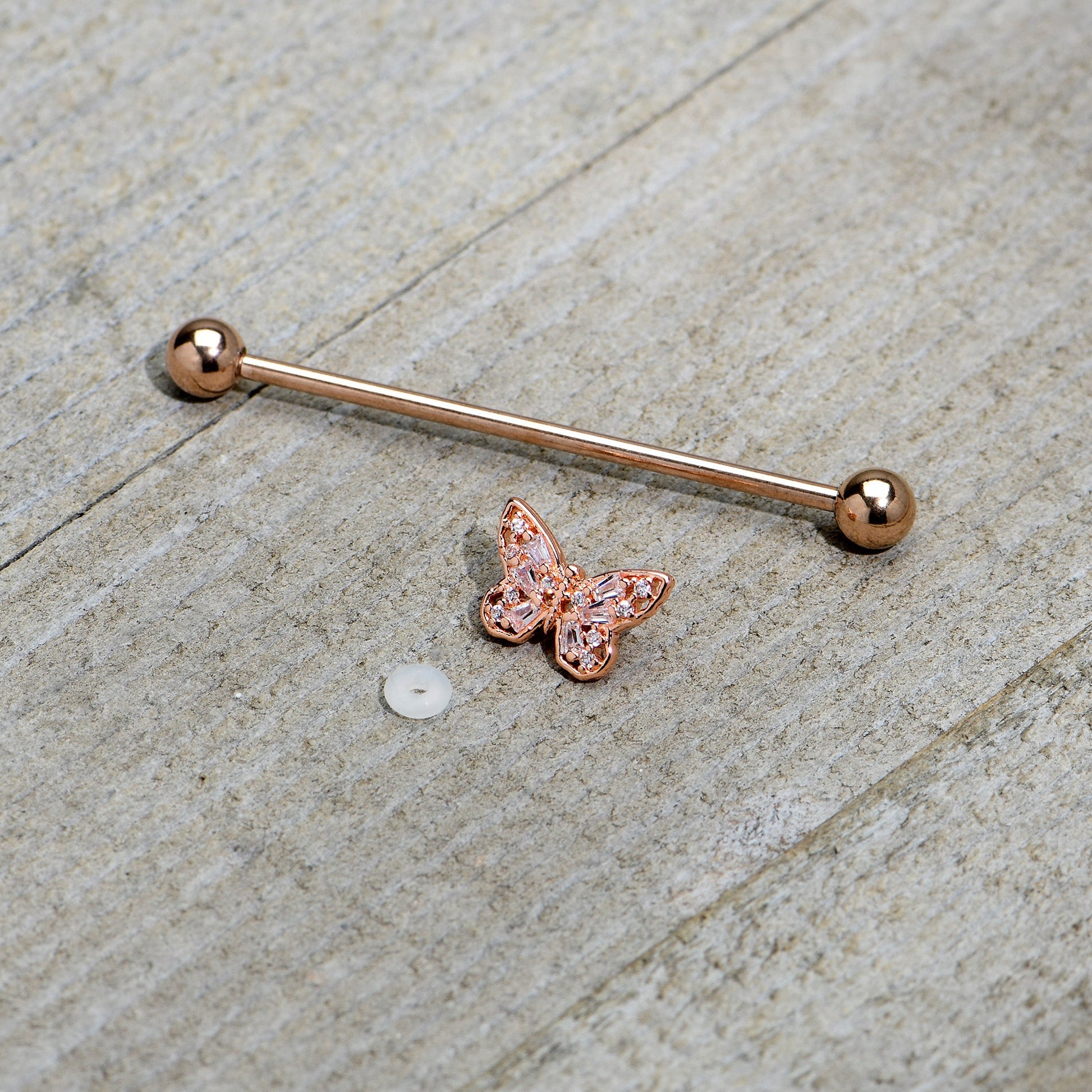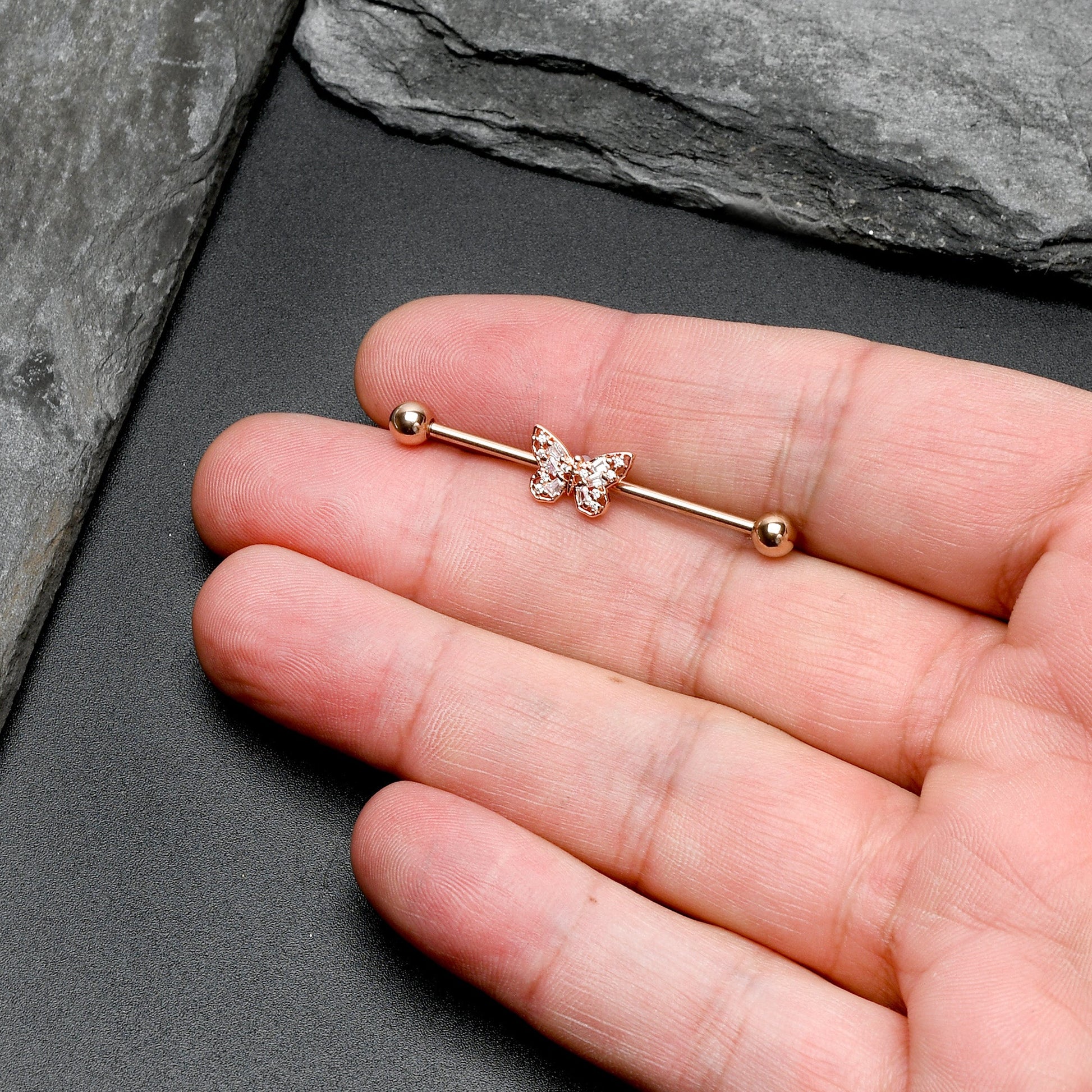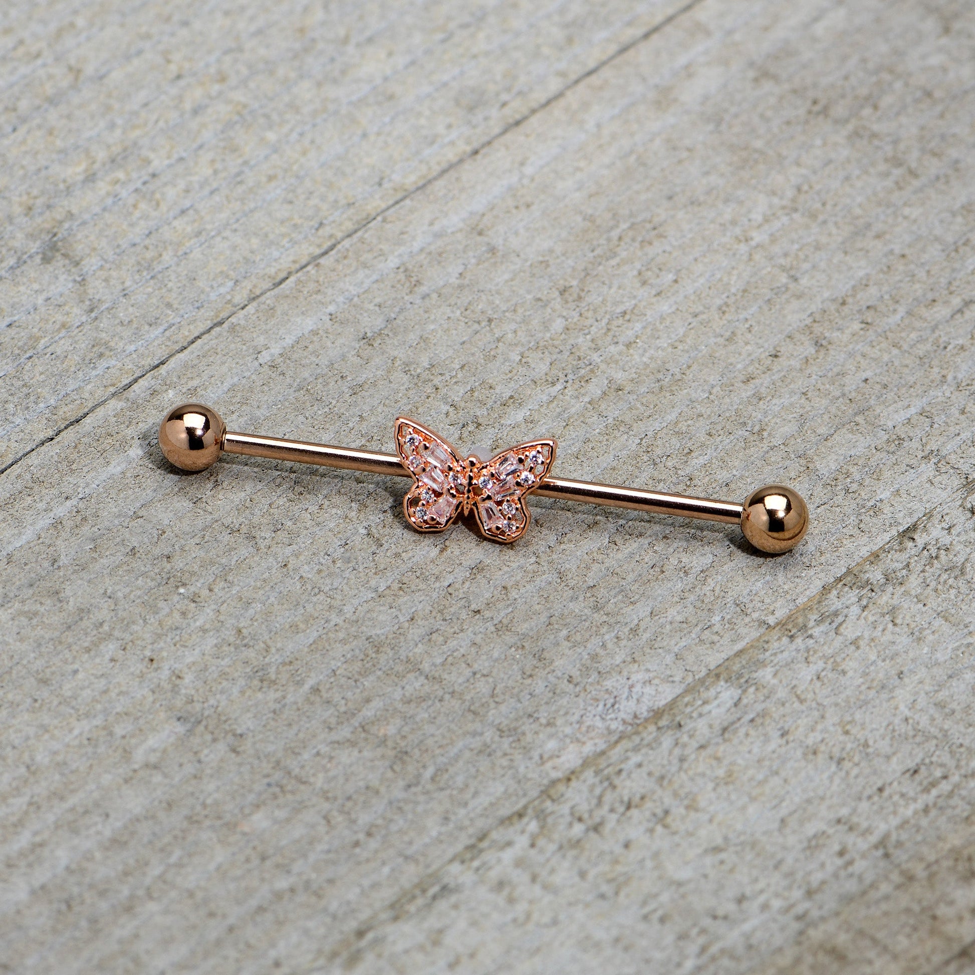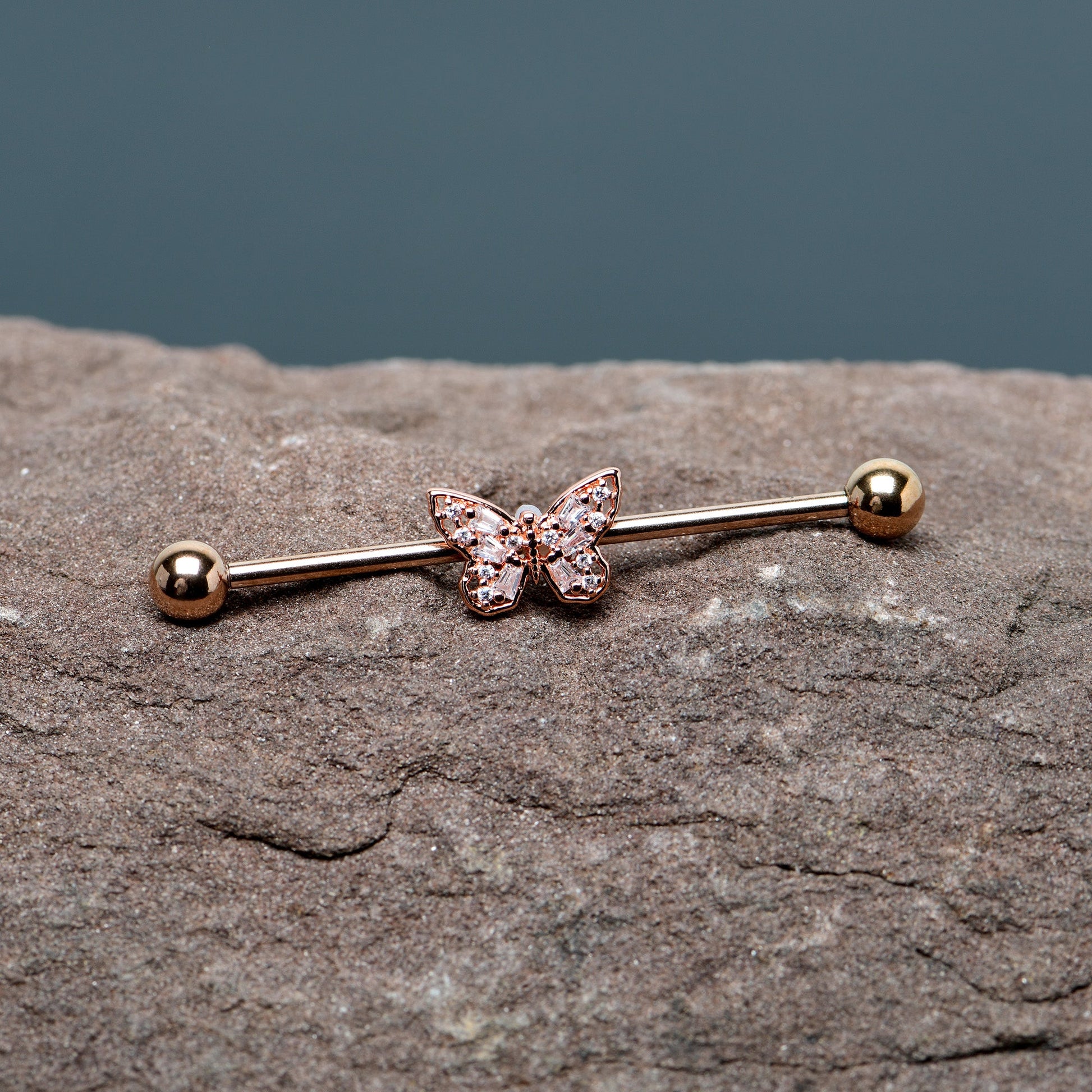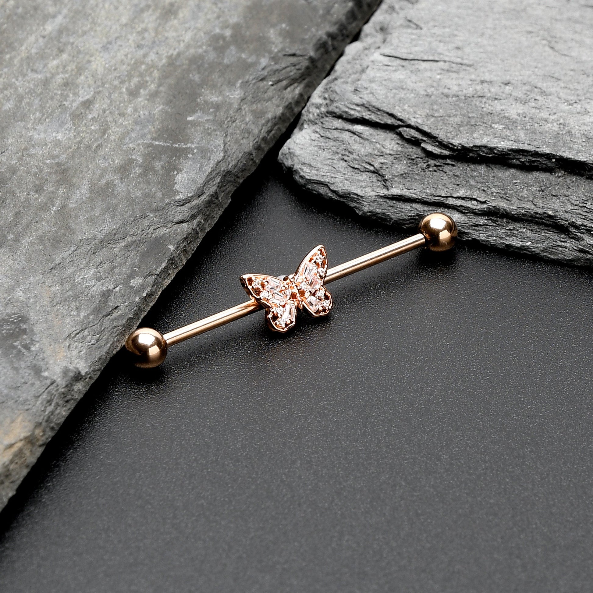 The butterfly on this 14 gauge helix barbell will make you want to go for baroque! It's made with a 1 1/2" rose gold tone PVD over 316L surgical grade stainless steel straight barbell with 5mm ball ends. It features a butterfly charm, with openwork wings for an airy feel. The butterfly is further embellished with clear gems for an ornate appearance and you can even slide this butterfly up and down the length of the barbell for the perfect look. This rococo butterfly barbell earring will make you want to fly!Specifications