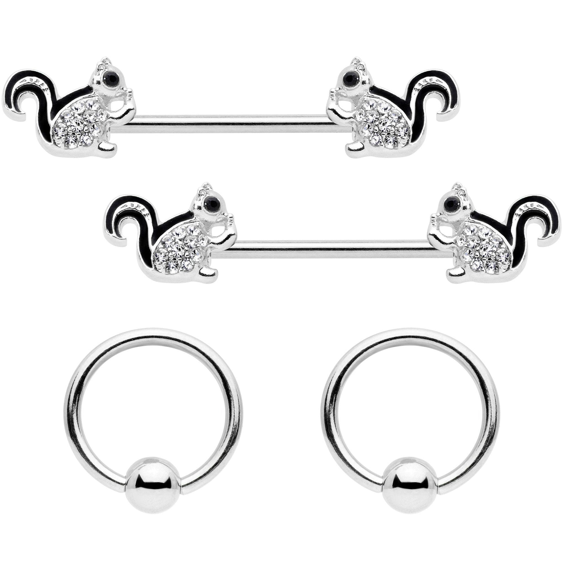If you want a variety of jewelry to wear in your nipple piercings then you will love this set of four 14 gauge nipple rings made with 9/16" durable 316L surgical grade stainless steel straight barbells and 1/2" durable 316L surgical grade stainless steel circular rings. This nipple jewelry set features a set of nipple barbells with squirrel ends set with clear gems as well as BCR captive rings with simple captive beads. Sold as a set of four.Specifications