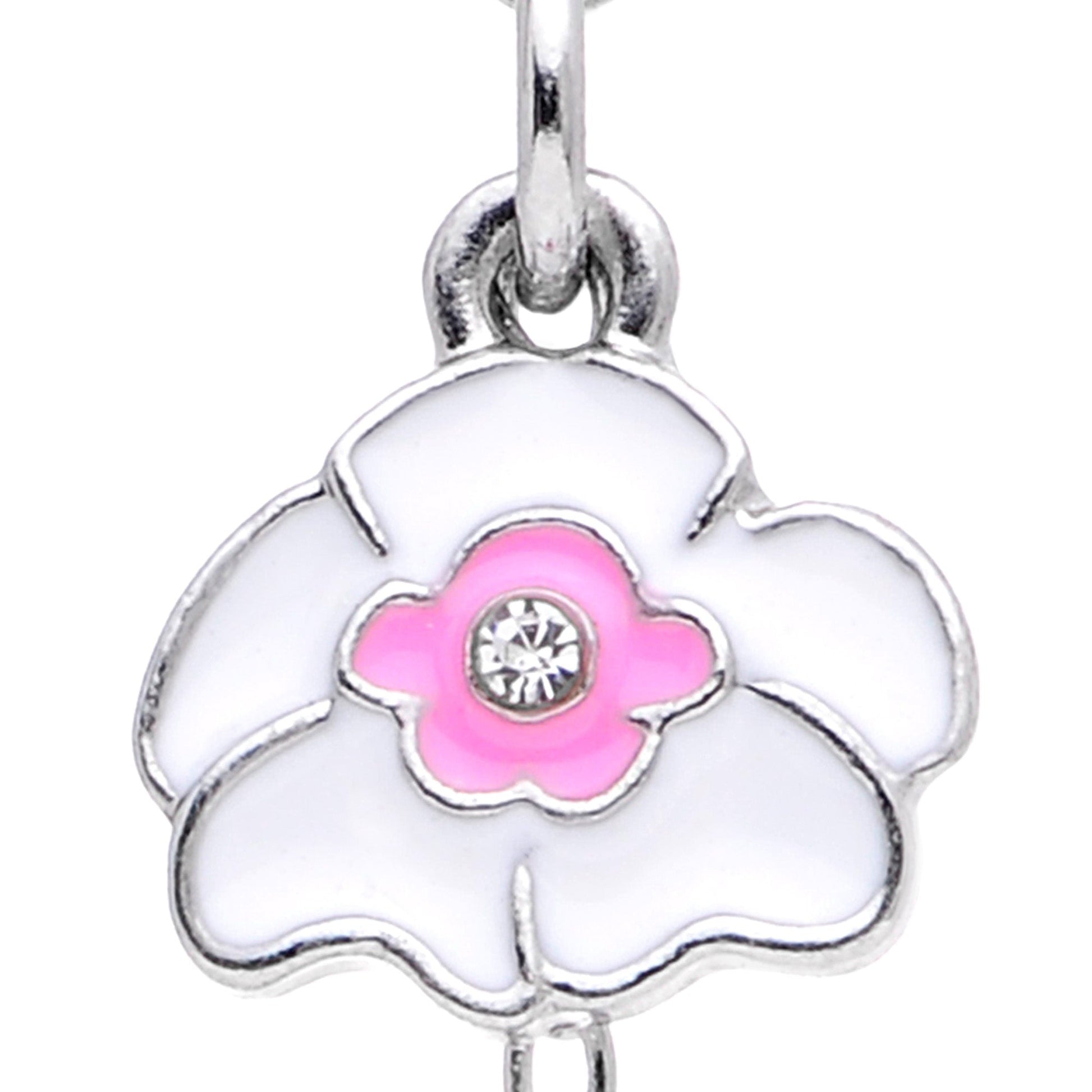 Flowers like to bloom in nice green spaces....even when they're dangling from your ear! This 14 gauge helix barbell is made with a 1 1/2" durable 316L surgical grade stainless steel straight barbell with 5mm ball ends. Dangling from one of the ball ends is a white flower charm with a pink center and a small clear gem. Also dangling from the ball end is a small length of chain supporting two cat's-eye-shaped gems in a deep rich green. This blossoming barbell industrial is bound to look beauteous in your industrial piercing!Specifications