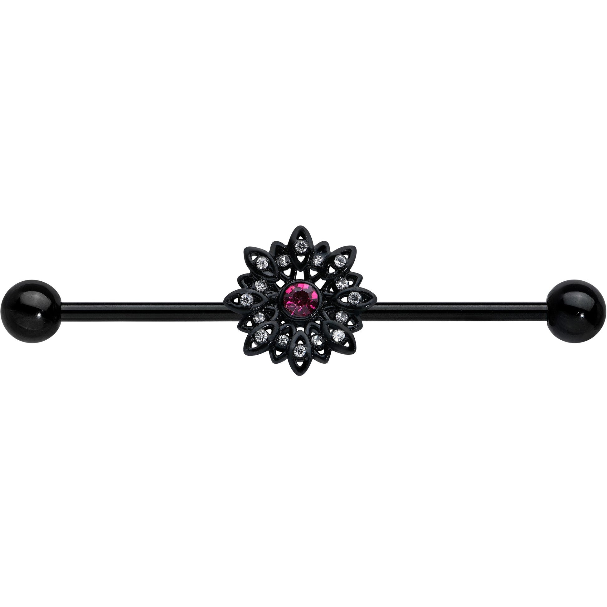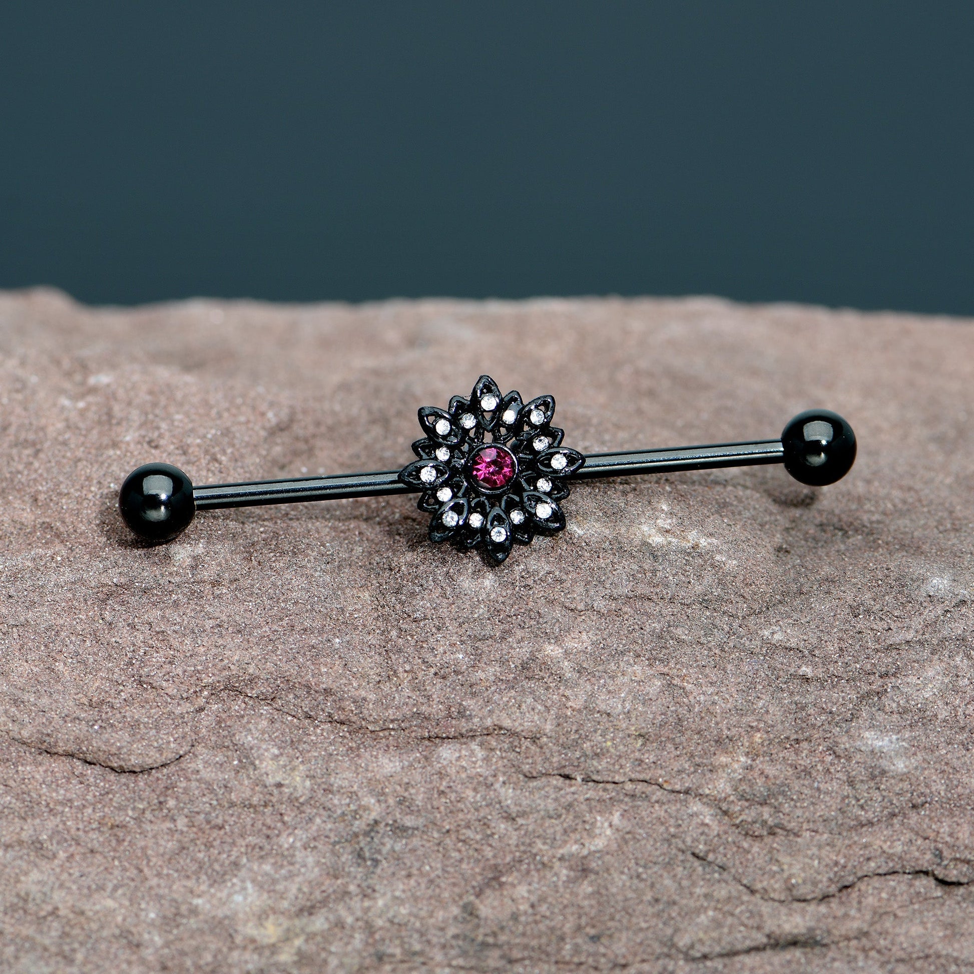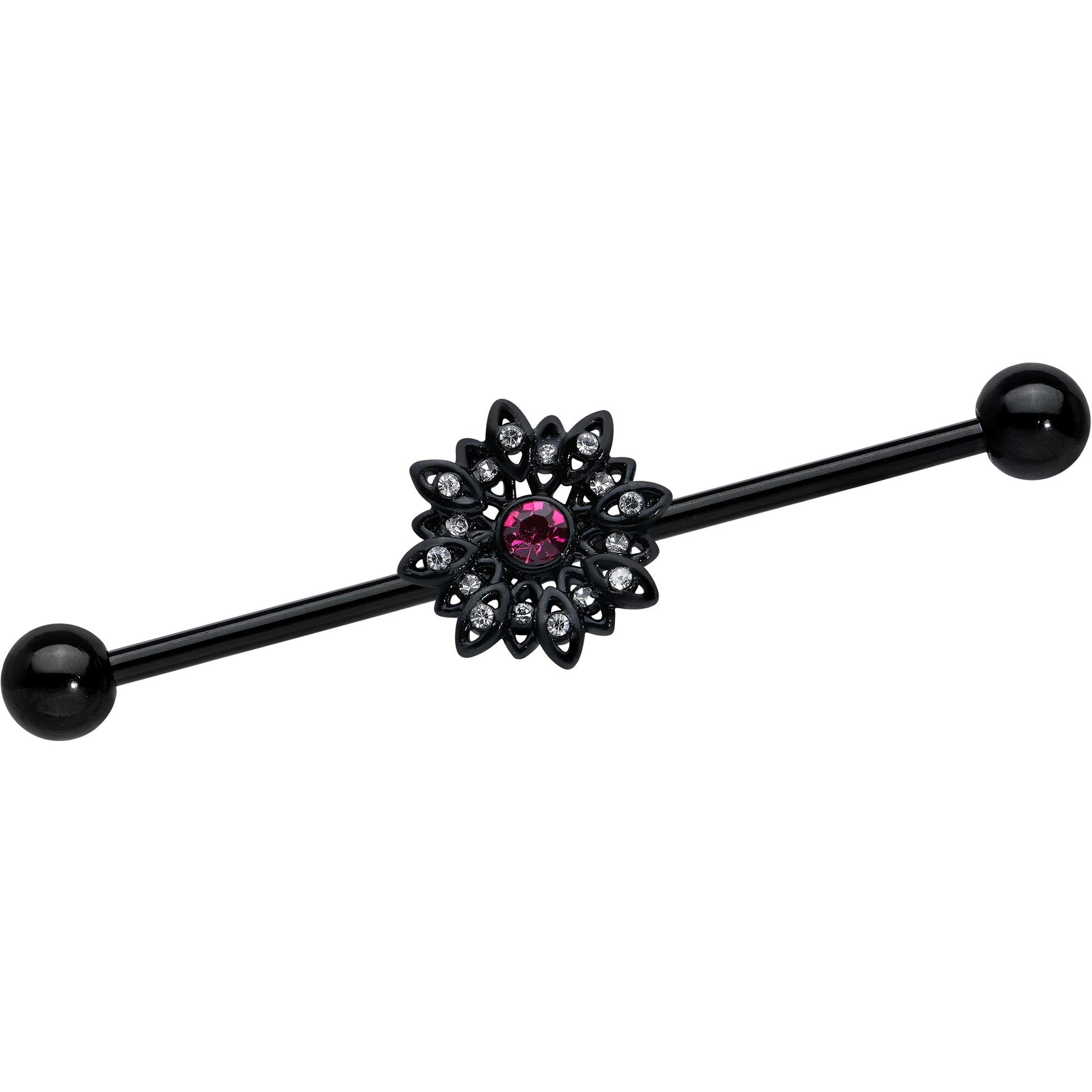 14 Gauge Clear Pink Gem Black Midnight Flower Industrial Barbell 38mm