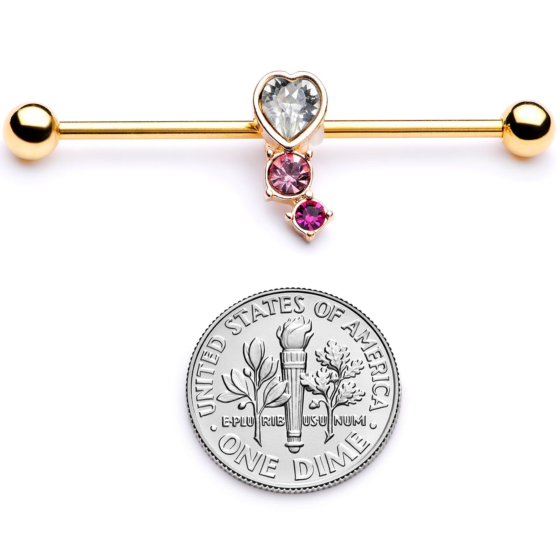 14G Clear Pink Red Gem Gold Tone Heart Industrial Barbell 38mm