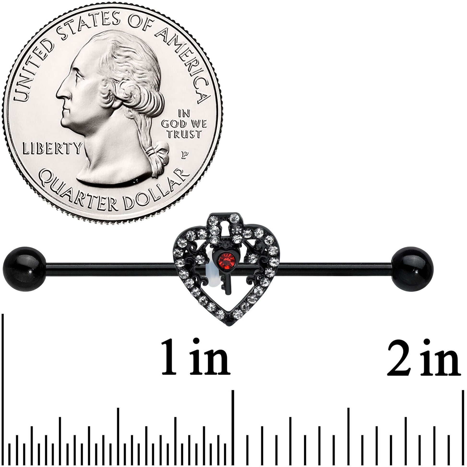 Unlock gothic style with this 14 gauge helix barbell! It's made with a 1 1/2" black PVD over 316L surgical grade stainless steel straight barbell with 5mm ball ends. It features a heart charm, set along the edges with clear gems. At the center point of the heart is a key, set at the top with a red gem for a truly striking color contrast. You can slide the charm up and down the length of the barbell for the perfect look. You're going to love this darkly elegant barbell earring with all your heart!Specifications