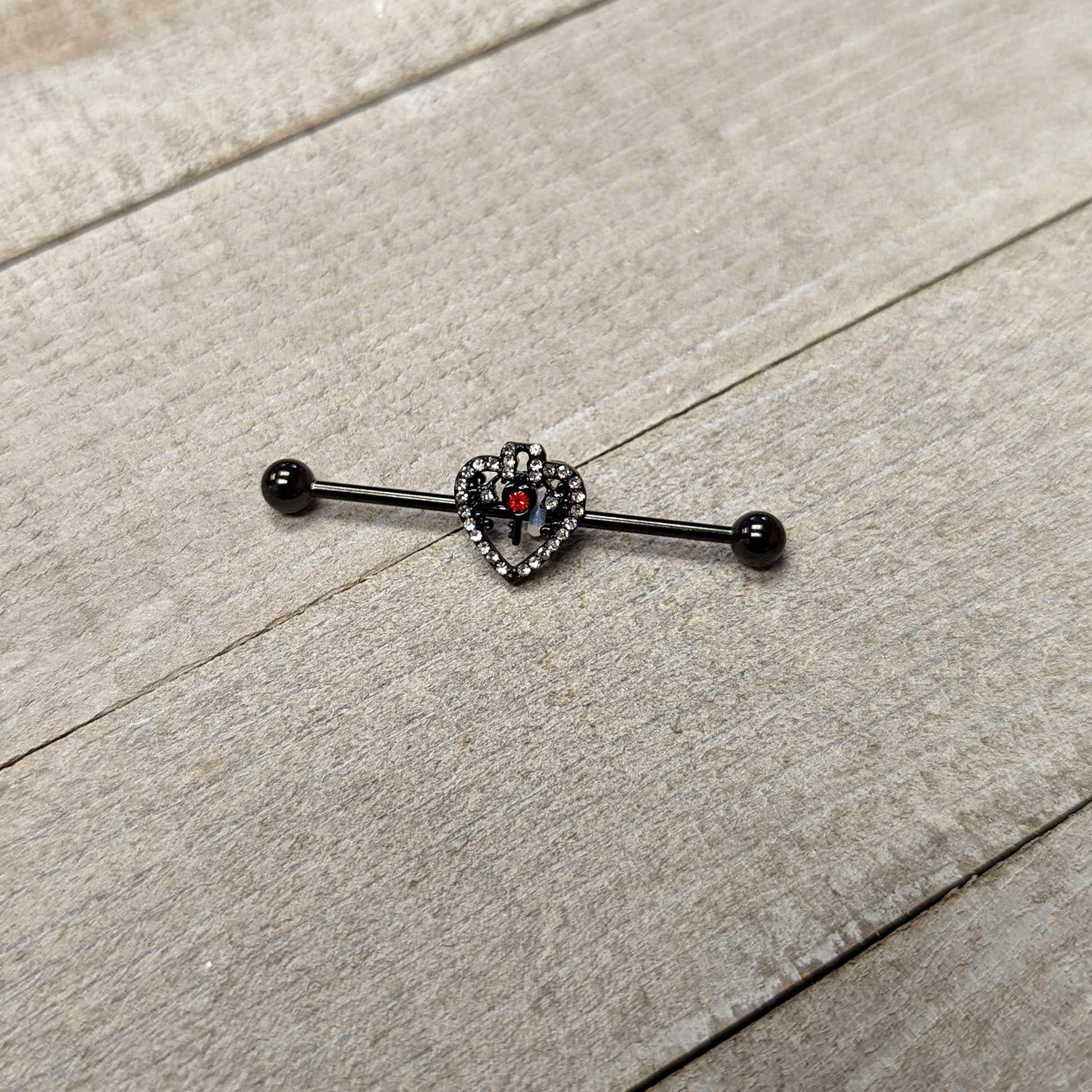 14G Clear Red Gem Black Key Heart Industrial Barbell 38mm