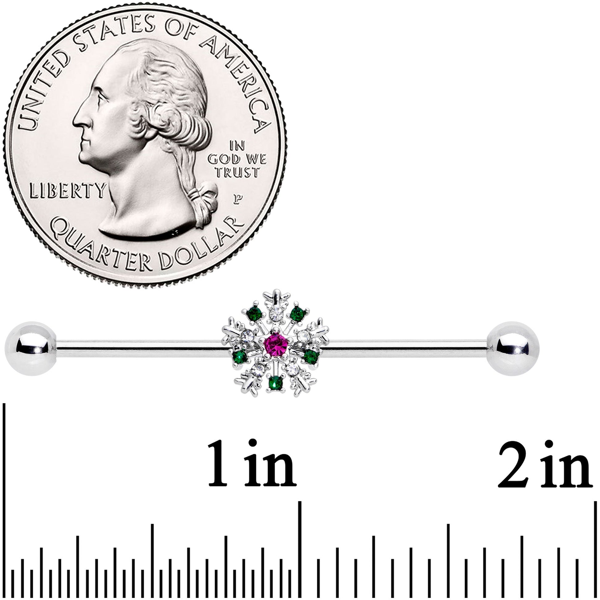 If you're ready to celebrate the holidays by switching out your double helix jewelry you'll love this 14 gauge industrial earring with tons of Christmas style. Made with a 1 1/2" durable 316L surgical grade stainless steel straight barbell, this cartilage earring features a clear and moveable red gem crest charm.Specifications