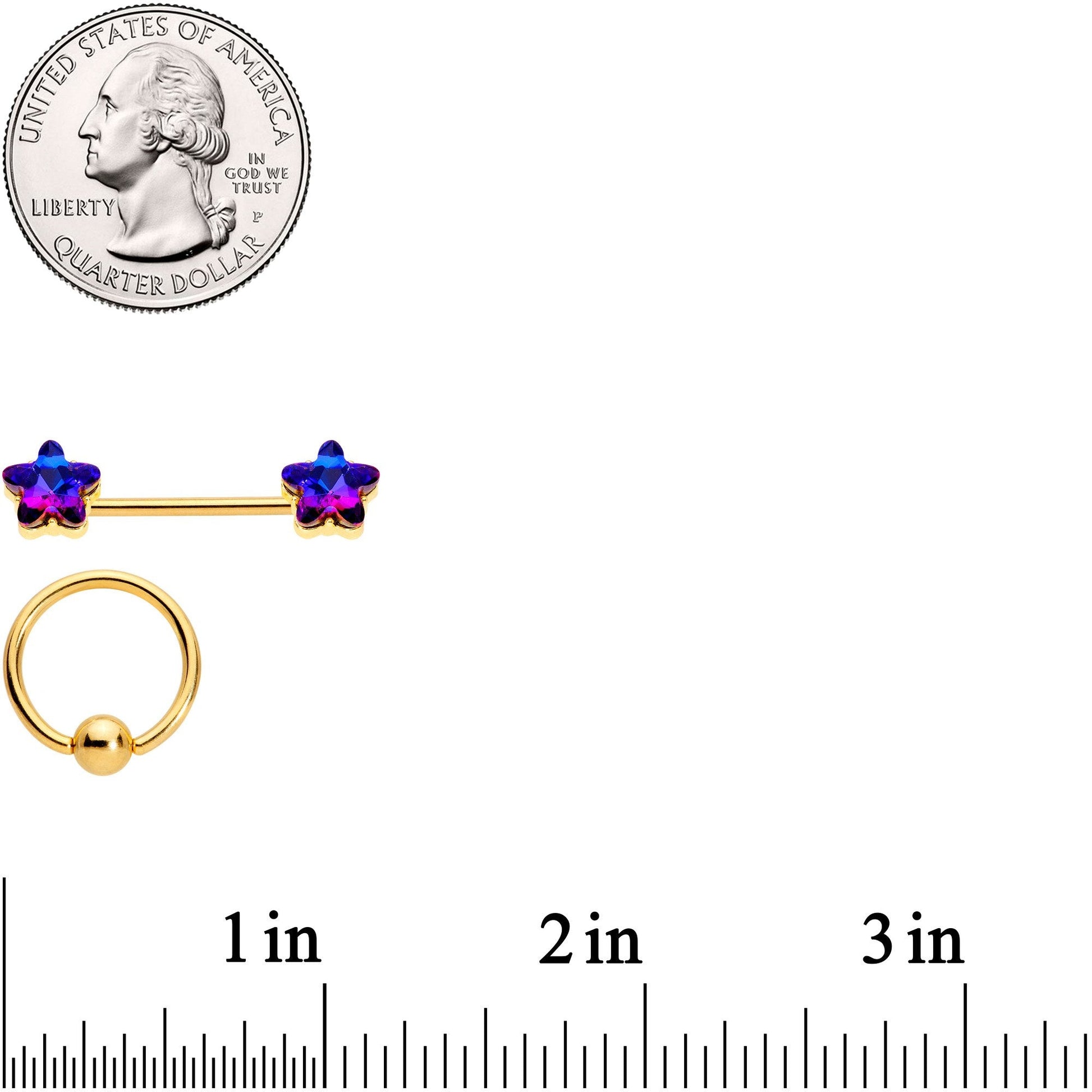You'll be seeing stars with this four piece set of 14 gauge nipple jewelry! There are dark blue star-shaped gems on the tips of 14mm gold tone plated over durable 316L surgical grade stainless steel straight barbells. There's also a pair of 8mm captive rings clasping matching blue star shaped gems. Those are also made with gold tone plated over durable 316L surgical grade stainless steel circular rings. Even better, the blue gems have a purple shift as the light moves. Watch the stars come out, in whatever form you choose. It's up to you! Sold as a set of four.