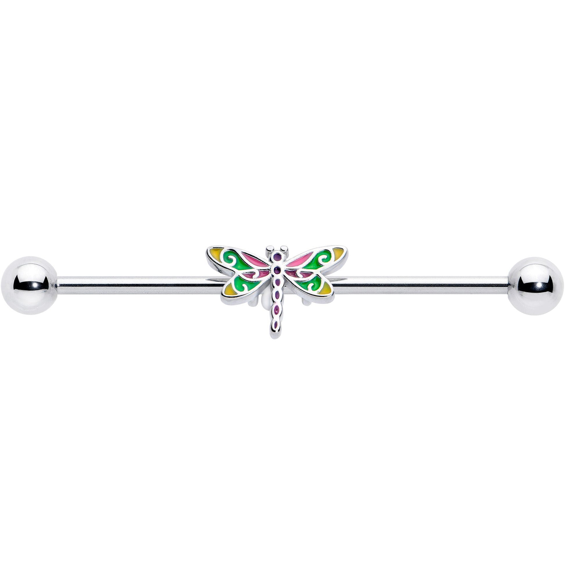 Let your look soar with style when you're rocking this 14 gauge helix barbell. It's made with a 1 1/2 inch 316L surgical grade stainless steel straight barbell with 5mm ball ends. It features a dragonfly charm, inlaid with green, yellow, pink and purple for a colorful look you can't miss and you can even slide it up and down the length of the barbell for the perfect look. Spread your wings and take flight with this colorful dragonfly barbell earring.Specifications