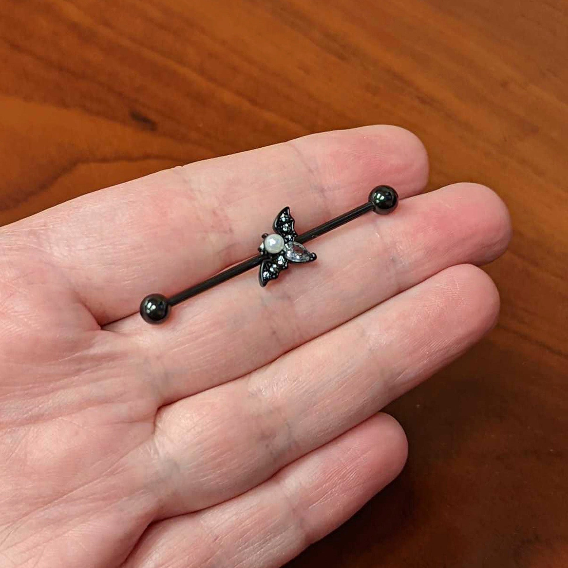14G Faux Pearl Black Bat Halloween Industrial Barbell 38mm