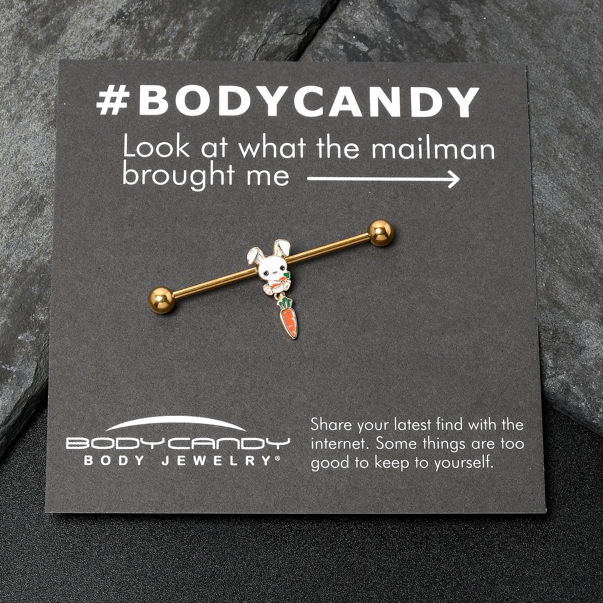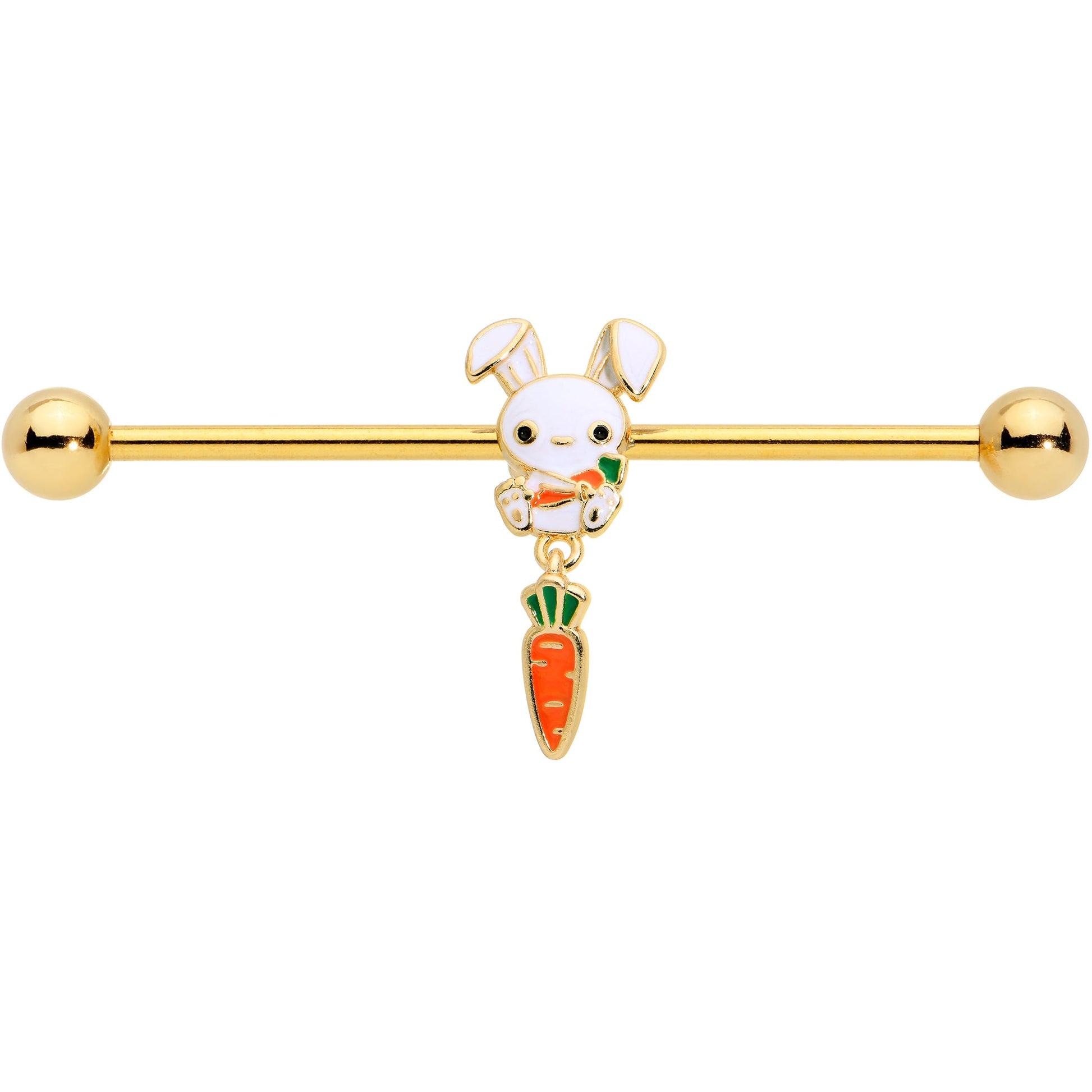 The Easter Bunny on this 14 gauge helix barbell is quite the little cutie. It is made with a 1 1/2 inch gold tone PVD over 316L surgical grade stainless steel straight barbell with 5mm ball ends. It features an Easter Bunny charm, with the bunny cradling a carrot. It also features a dangling carrot charm for a cohesive and eye catching look. You can even slide it up and down the length of the barbell for the perfect look. The bunny on this barbell earrings is one you will want hanging around all year long.Specifications
