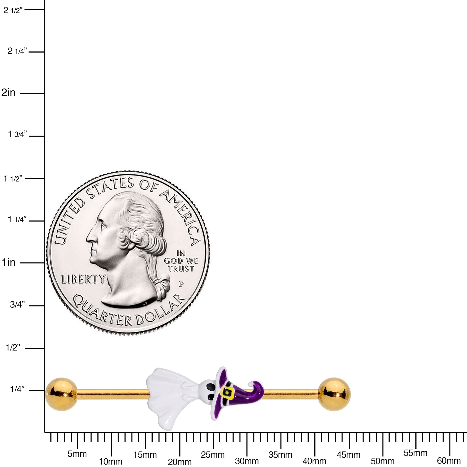 This 14 gauge helix barbell is sure to haunt you with its simple beauty! It's made with a 1 1/2" gold tone PVD over 316L surgical grade stainless steel straight barbell with 5mm ball ends. It features a charm of a white ghost, with large eyes inlaid in black. The ghost is wearing a purple witch's hat with a yellow buckle and white detailing for a cohesive look. You can even slide it up and down the length of the barbell to get just the right look. Add some magic to your look this with this haunting, Halloween-themed barbell earring.Specifications