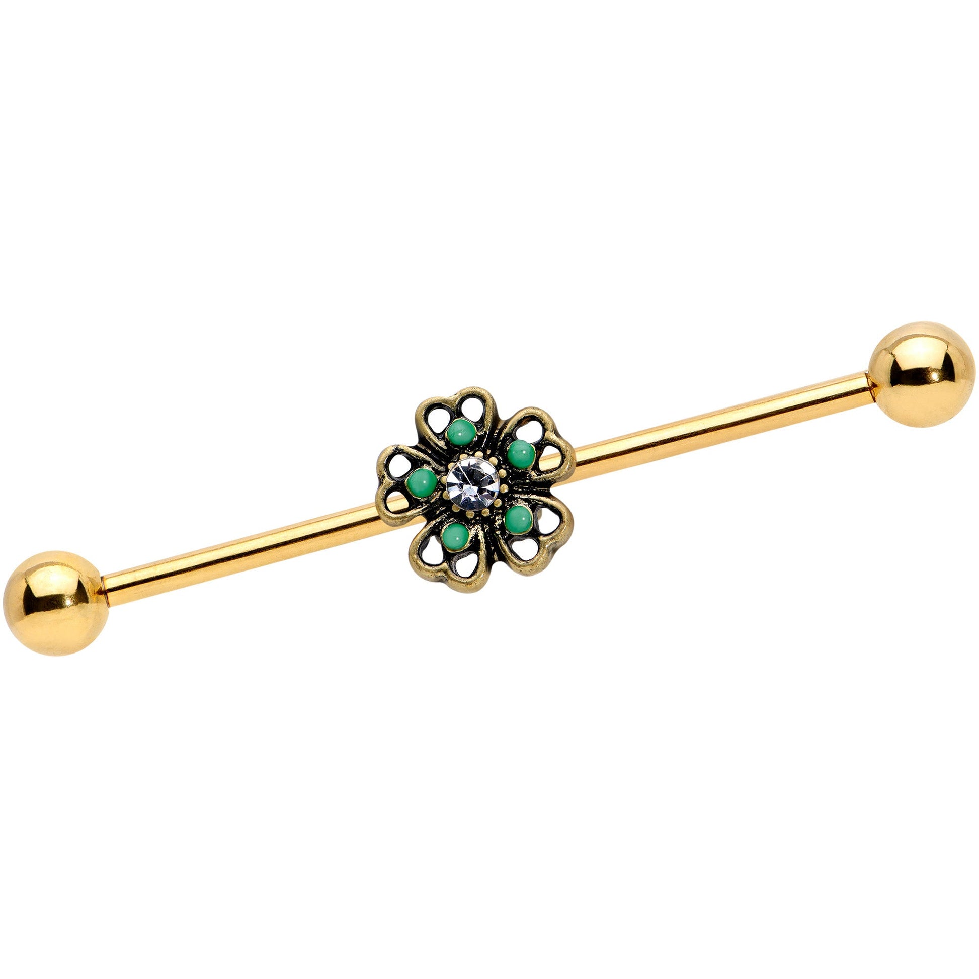 14 Gauge Gold Tone Green Flower St Patricks Industrial Barbell 38mm
