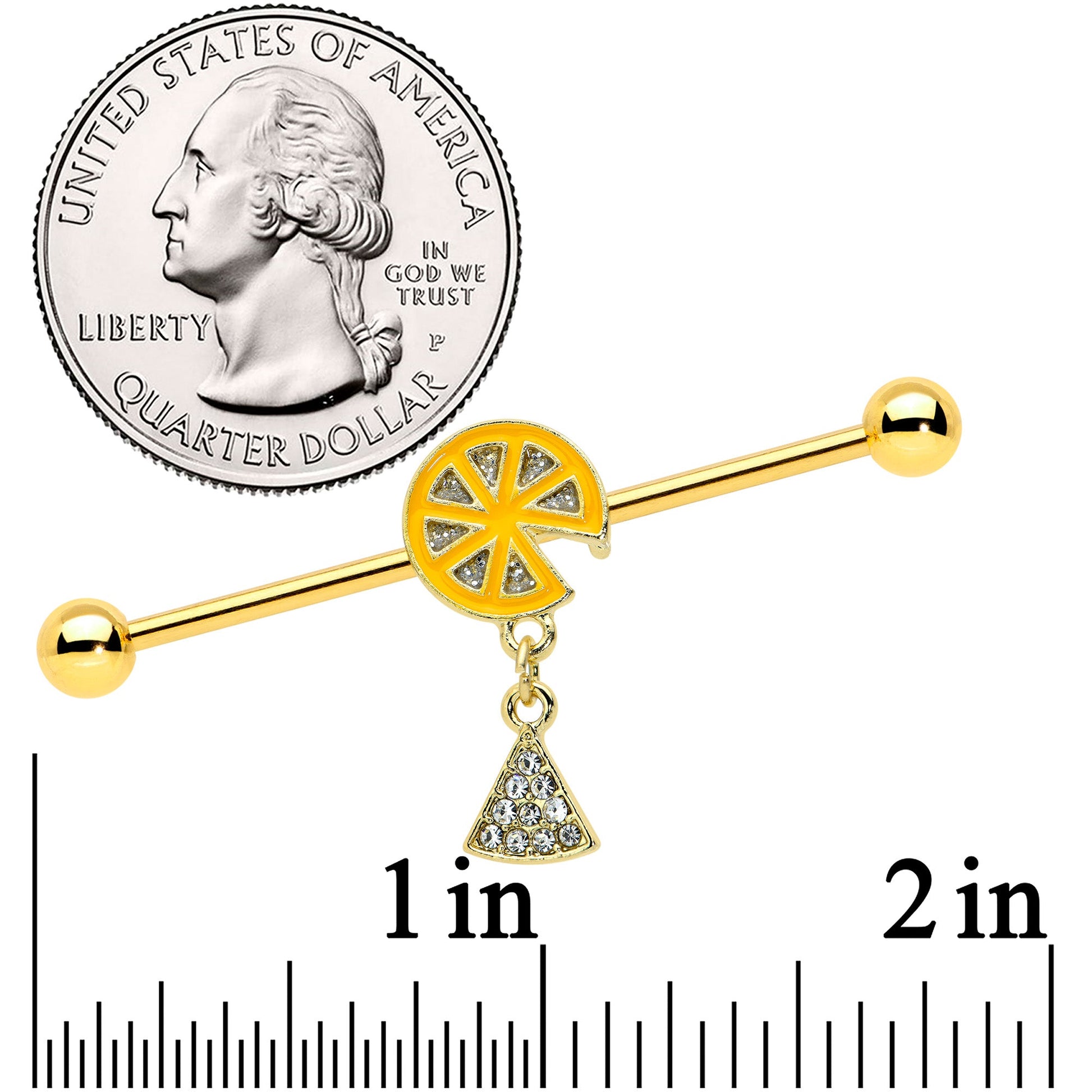 This 14 gauge helix barbell is sweet, tasty and looks delicious! It's made with a 1 1/2" gold tone PVD over 316L surgical grade stainless steel straight barbell with 5mm ball ends. It features an orange slice charm, with pulp detailing and one wedge missing. Dangling from the charm is the missing wedge, paved with clear gems for an added touch of style. And you can slide the orange up and down the length of the barbell for a perfectly delicious look! If you're ready to get your citrus fruit on this summer, pick this yummy orange slice barbell earring!Specifications