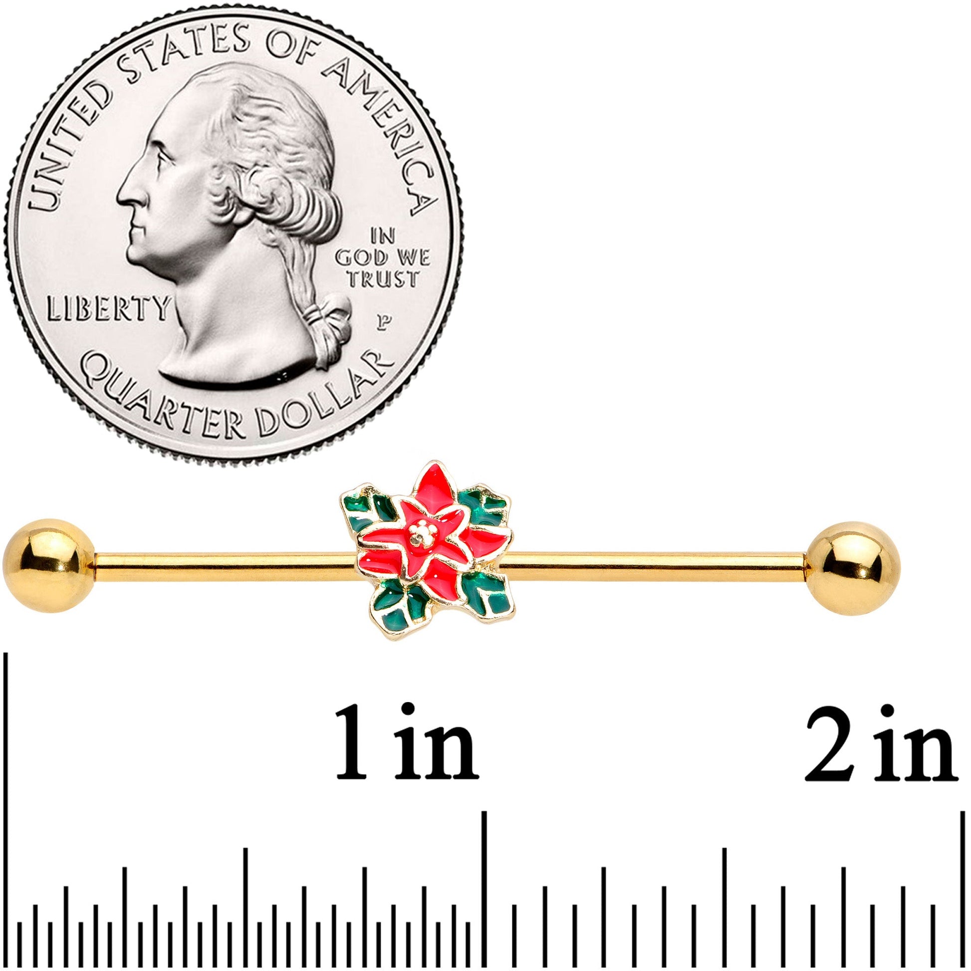 If you love to decorate for the holidays then you will love decorating your double helix piercing with this 14 gauge industrial jewelry! Made with a 1 1/2" gold tone PVD over 316L surgical grade stainless steel straight barbell, this barbell industrial features a moveable red and green poinsettia Christmas charm that will make a perfect Christmas gift!Specifications