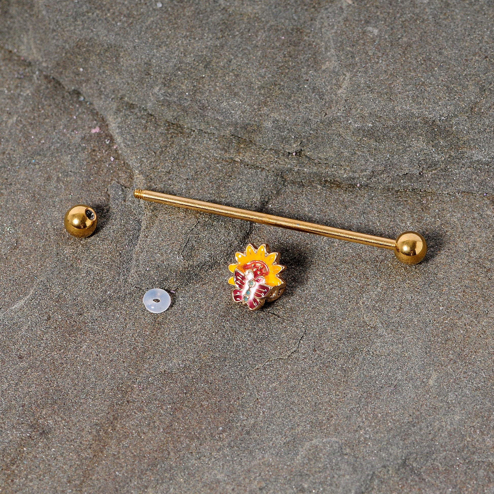 14 Gauge Gold Tone Red Yellow Butterfly Flower Industrial Barbell 38mm