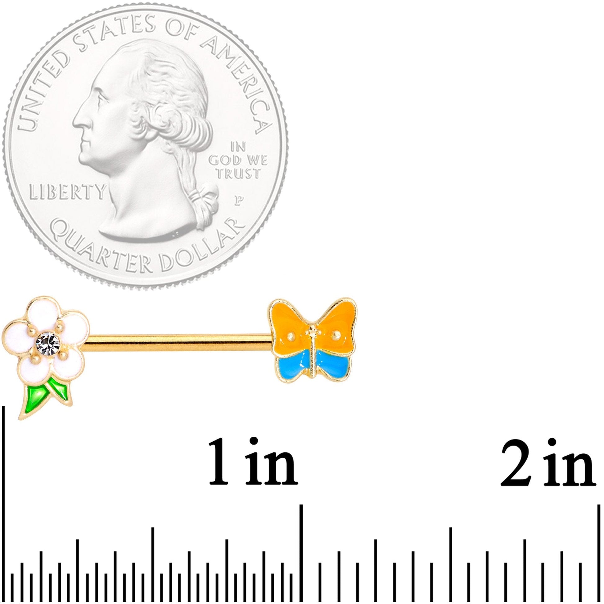 Spring brings fresh new flowers and what do flowers always bring? Butterflies! This set of 14 gauge nipple piercings is made with 9/16" gold tone PVD over 316L surgical grade stainless steel straight barbells featuring a small flower end, with the leaves inlaid in green and the petals inlaid in white. At the center of each flower is a small clear gem. The other end features a butterfly, wings inlaid in orange on the top and blue on the bottom. Let the flowers bloom and the butterflies perch in your piercings with these colorful nipple rings! Sold as a set of two.