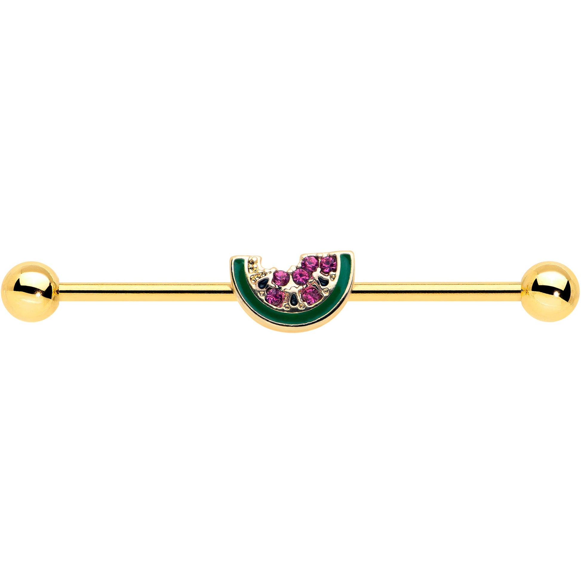 Take a bite of style with this tasty 14 gauge helix barbell. It is made with a 1 1/2 inch gold tone PVD over 316L surgical grade stainless steel straight barbell with 5mm ball ends. It features a watermelon slice charm, inlaid in red and green with black seed embellishments. The tasty fruit even has a bite already taken out and you can even slide it up and down the length of the barbell for the perfect look. You too will find this yummy melon barbell earring irresistible.Specifications