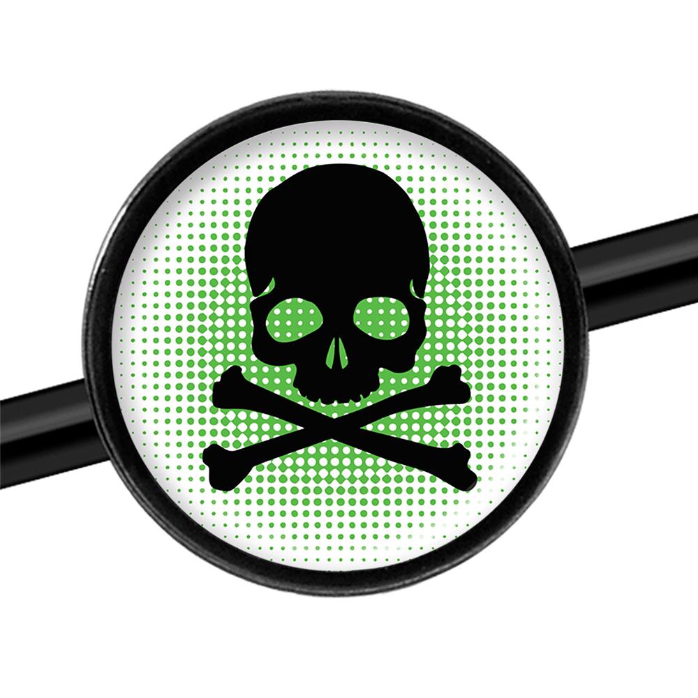 If you love the color green and scary Halloween skull and crossbones then this 14 gauge industrial earring is right for you! Made with a 1.45" black anodized over 316L surgical grade stainless steel straight barbell, this straight barbell jewelry features a nonmoving logo inlay charm and 6mm ball ends.