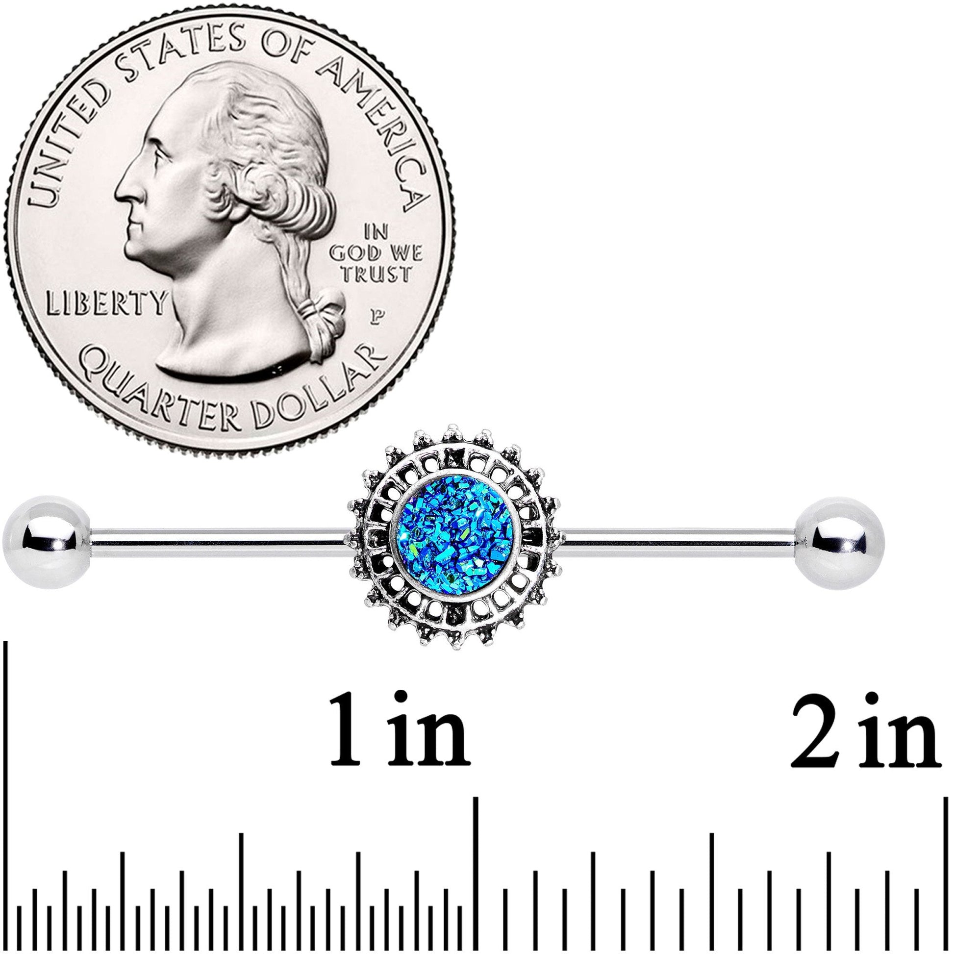 If you want all of your piercings to be in season this Halloween then you will love this 14 gauge industrial piercing with spooky style. Made with a 1 1/2" durable 316L surgical grade stainless steel straight barbell, this industrial jewelry features a moveable green faux druzy charm that will catch the light day or night.Specifications