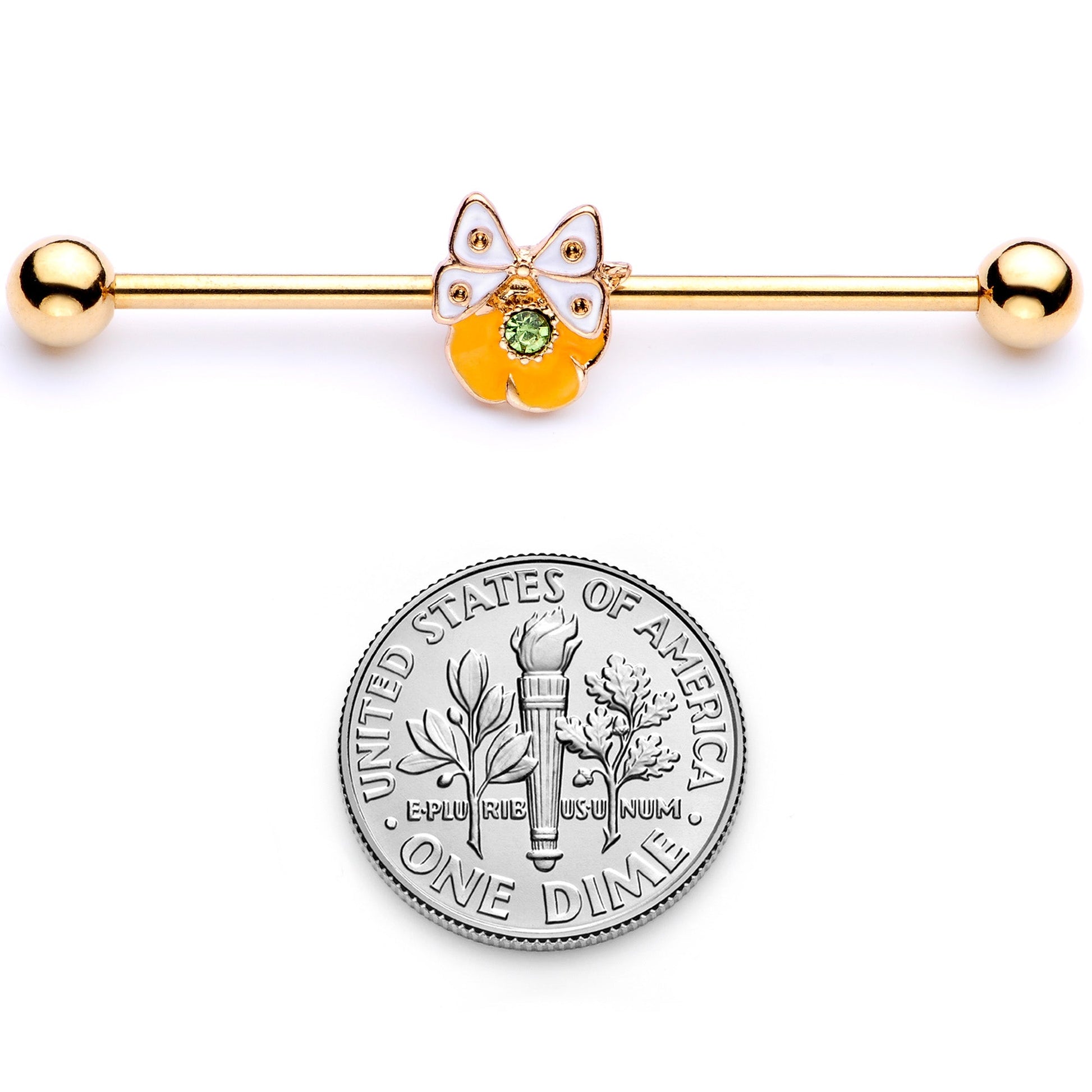 This beautiful butterfly just wants to take a breather while hanging from your industrial piercing with this 14 gauge helix barbell! It's made with a 1 1/2" gold tone PVD over 316L surgical grade stainless steel straight barbell with 5mm ball ends and features a moveable white butterfly and yellow flower charm that has a green gem at the center. This is a look that will have you feeling like springtime all year long!Specifications