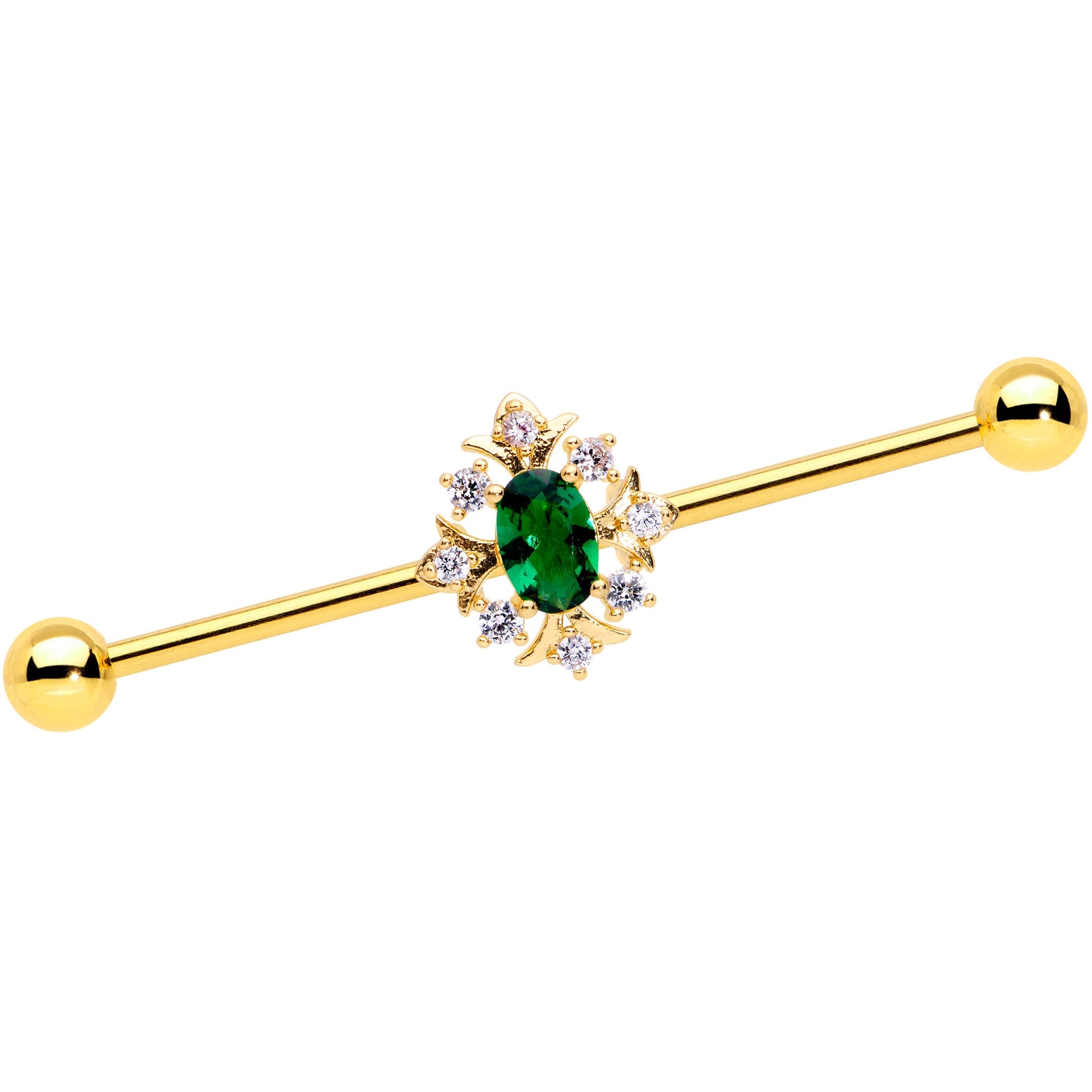 Leave everyone green with envy when you're rocking this 14 gauge helix barbell! It's made with a 1 1/2" gold tone PVD over 316L surgical grade stainless steel straight barbell with 5mm ball ends. It features an oval deep green gem charm, embellished with sprays of clear gems extending out like the rays of the sun. You can even slide the charm up and down the barbell for the perfect look. Go green and gorgeous with this stunning sunburst barbell earring!Specifications