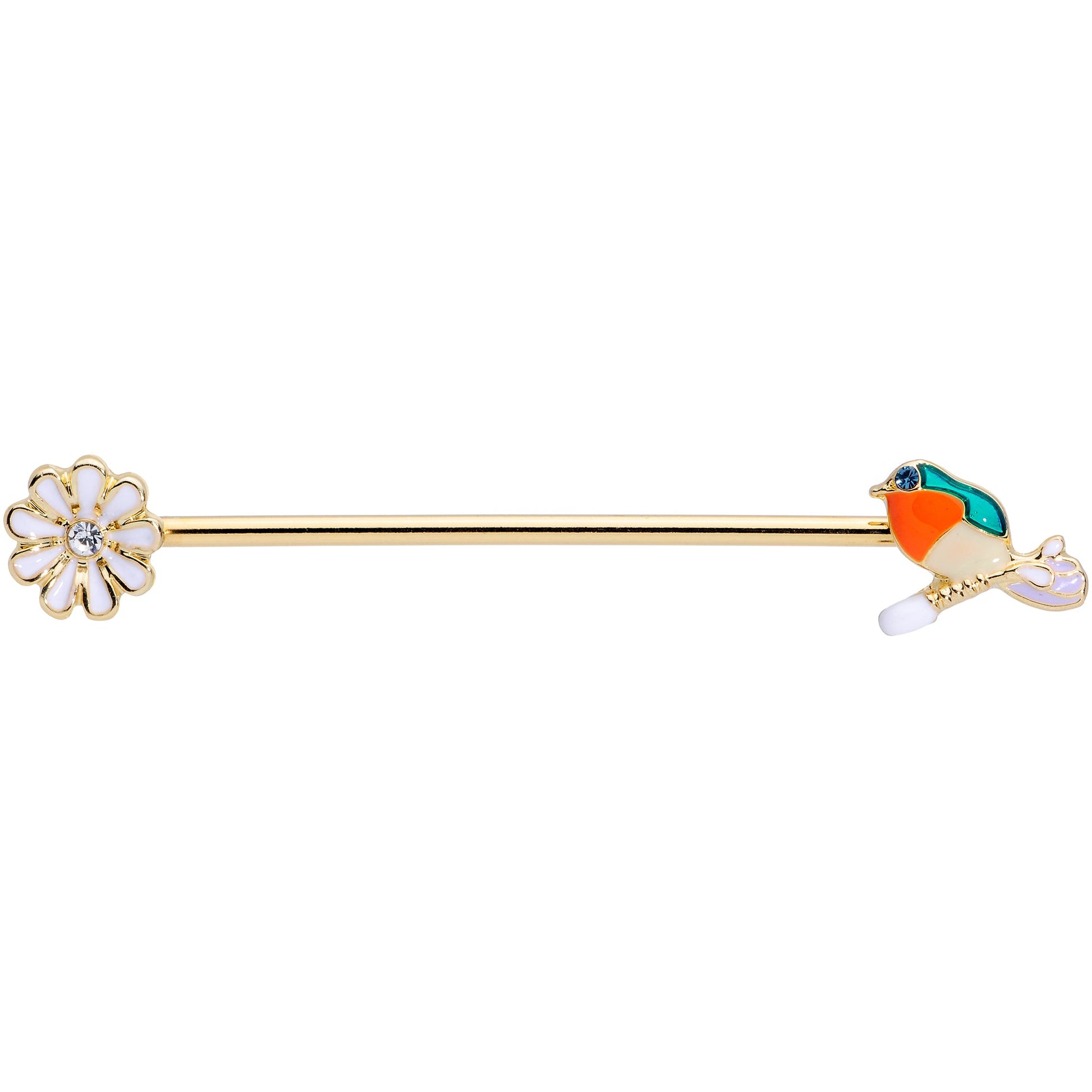 Let this beautiful bird pull up a perch and bloom in your industrial piercing with this 14 gauge helix barbell! It's made with a 1 1/2" gold tone PVD over 316L surgical grade stainless steel straight barbell. One end features a gorgeous orange and white songbird charm with a green gem eye and matching green embellishment. The other end features a white flower with a clear gem center. With such stunning details, this beautiful bird and flower industrial jewelry will make you want to burst into song!Specifications