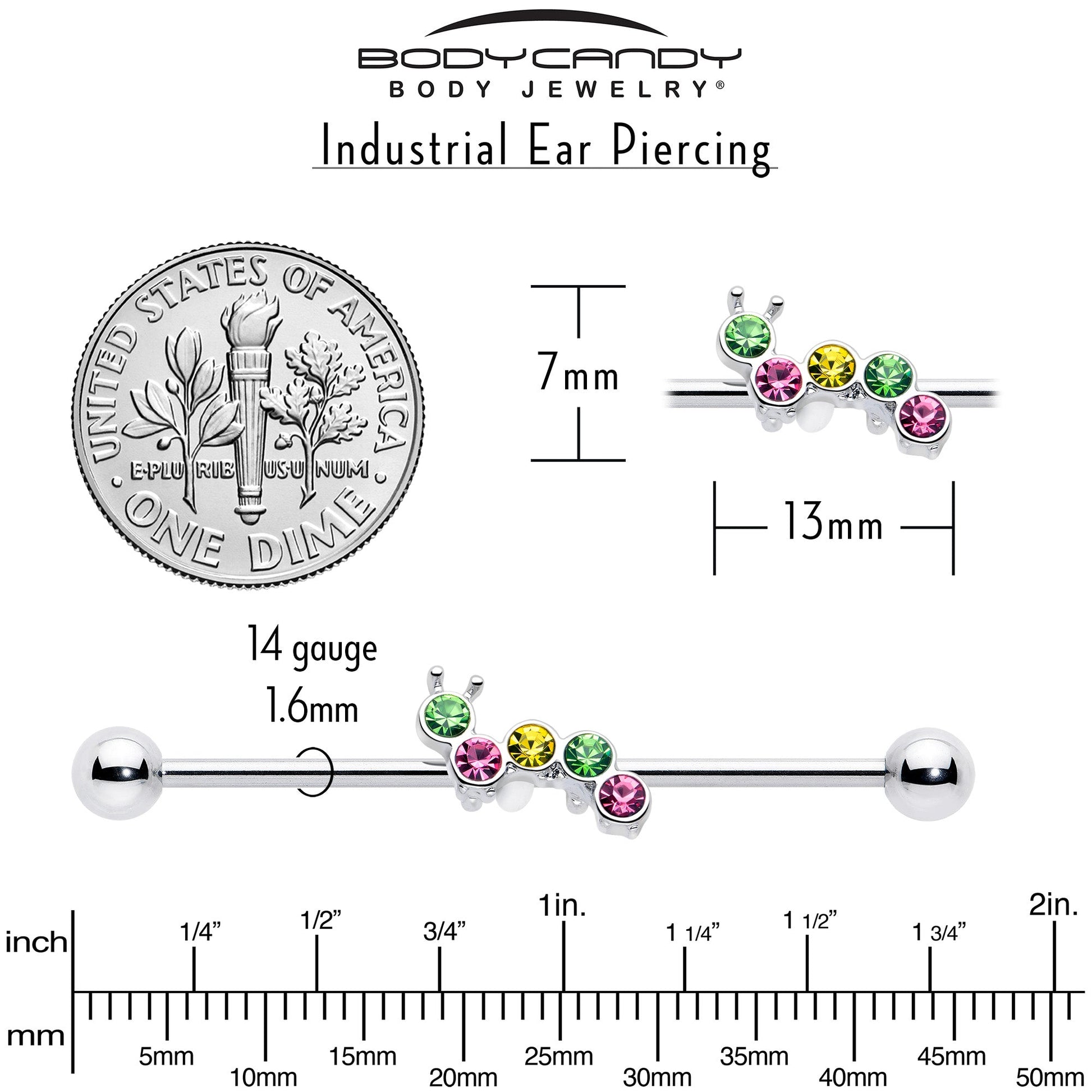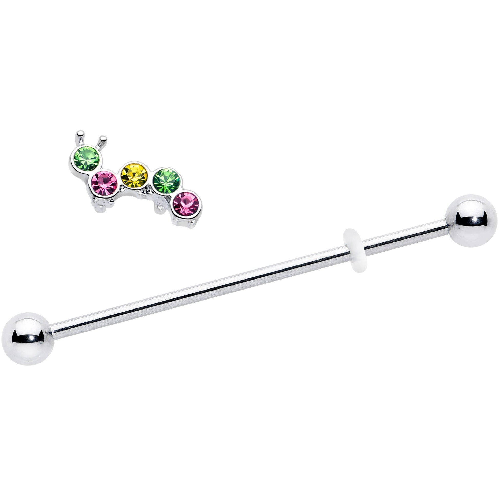 Get hungry for colorful fabulousness with the caterpillar on this 14 gauge helix barbell. It is made with a 1 1/2 inch 316L surgical grade stainless steel straight barbell with 5mm ball ends. It features a caterpillar charm, composed entirely of green, pink, and yellow gems. It is further embellished with tiny antennae detailing and you can even slide it up and down the length of the barbell for the perfect look. Conjure a whimsical new style with this insect barbell earring.Specifications