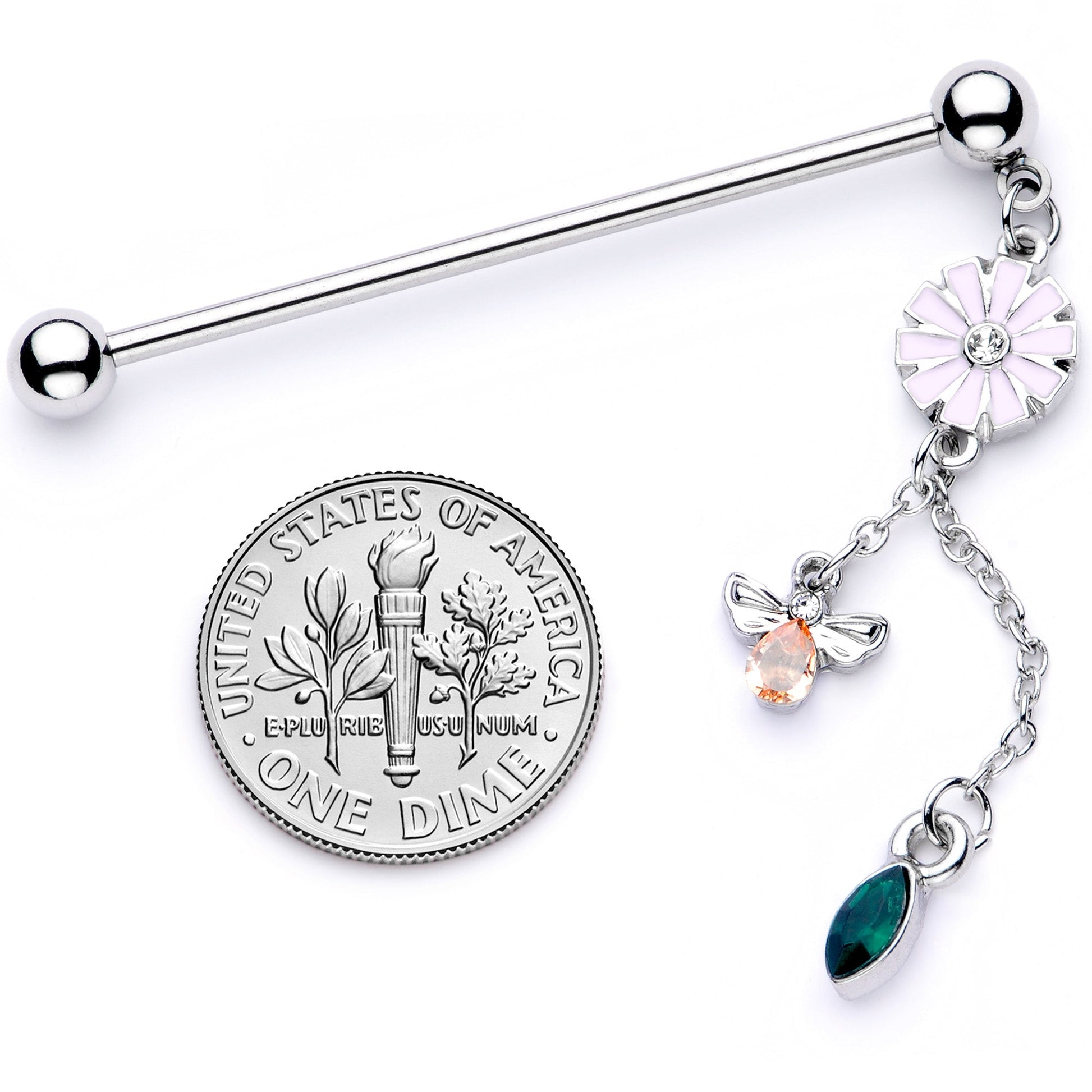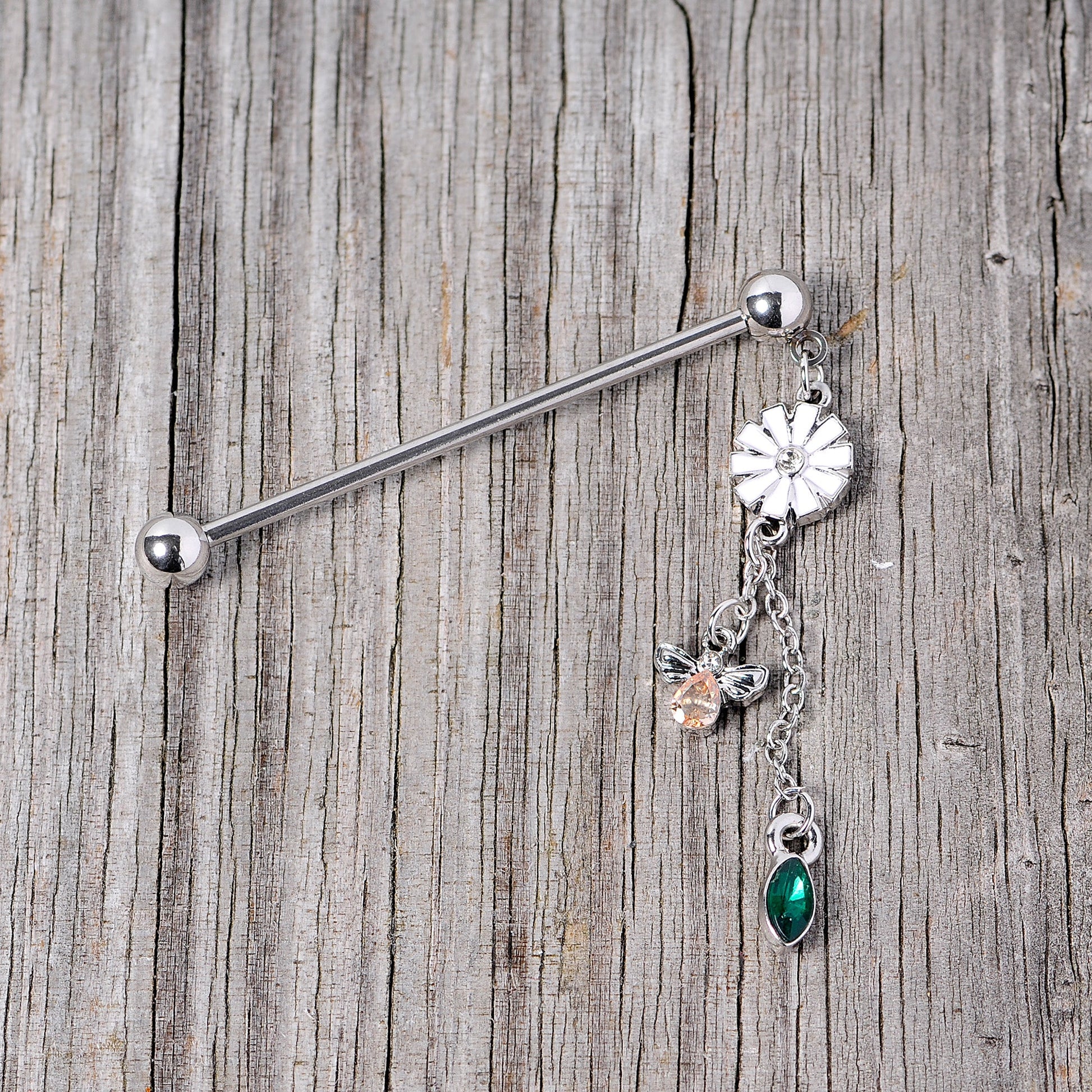 This 14 gauge helix barbell will draw eyes to your piercing like a bee.....to this flower! This barbell earring is made with a 1 1/2" durable 316L surgical grade stainless steel straight barbell with 5mm ball ends. Dangling from one ball end is a pink flower charm with a clear gem at its center. The flower supports two chains. Dangling from the shorter chain is a small bee charm, with a yellow gem for its body and a clear gem for its head. Dangling from the longer chain is a deep green gem with a striking cats-eye shape charm. The contrast of colors is absolutely spectacular. This industrial earring is sure to have everyone buzzing!Specifications