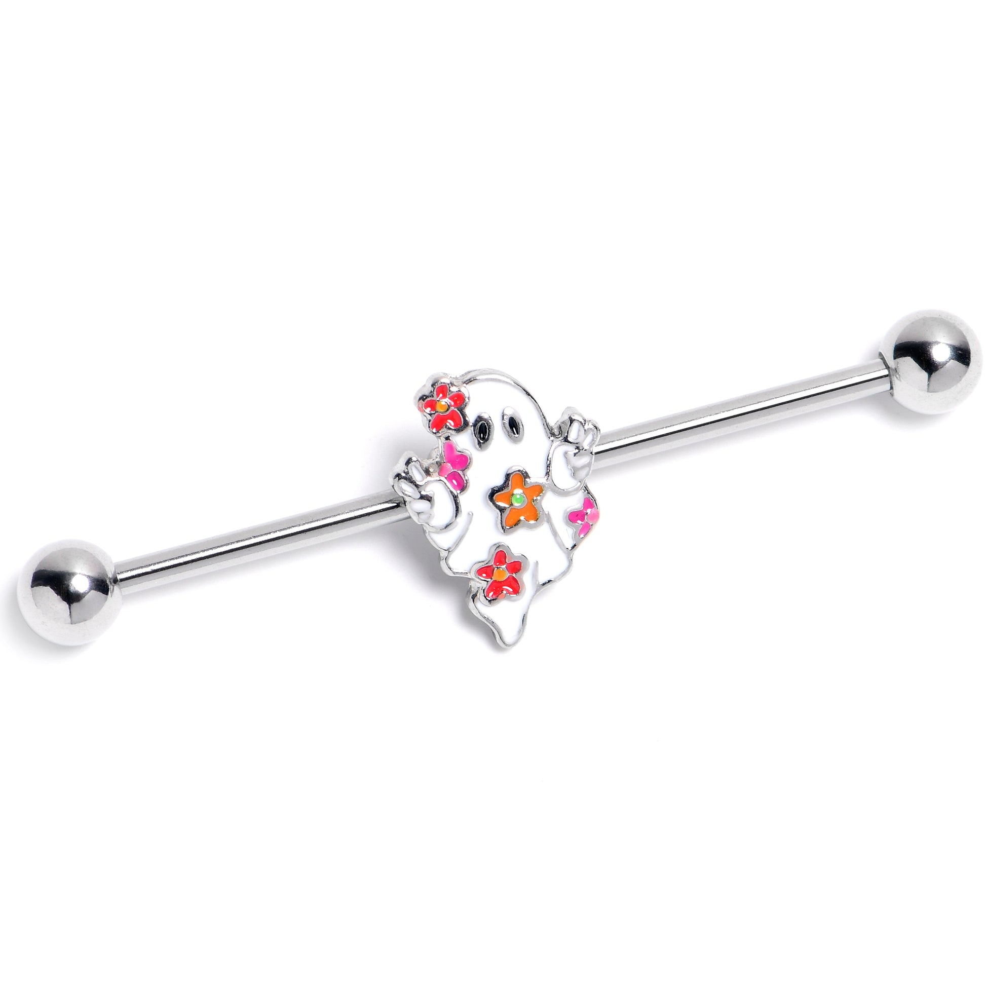The ghost on this 14 gauge helix barbell is oozing with flowery style. It is made with a 1 1/2 inch 316L surgical grade stainless steel straight barbell with 5mm ball ends. It features a ghost charm, with black inlay eyes. The ghost is also covered in colorful floral embellishments. You can even slide it up and down the length of the barbell for the perfect look. You will have the hippest Halloween ever with this stylish ghost barbell earring.Specifications