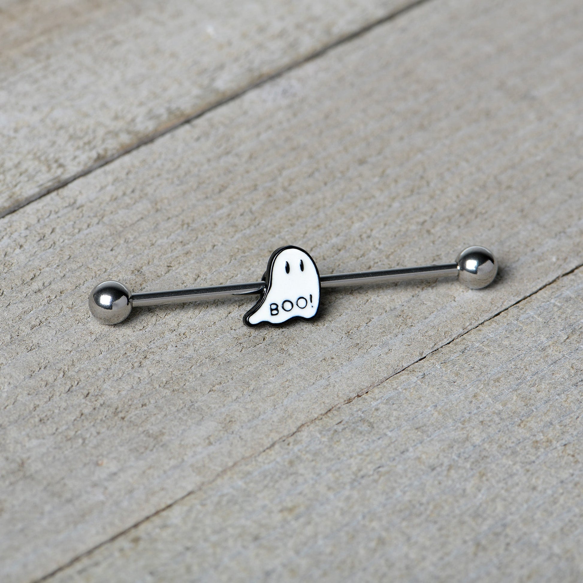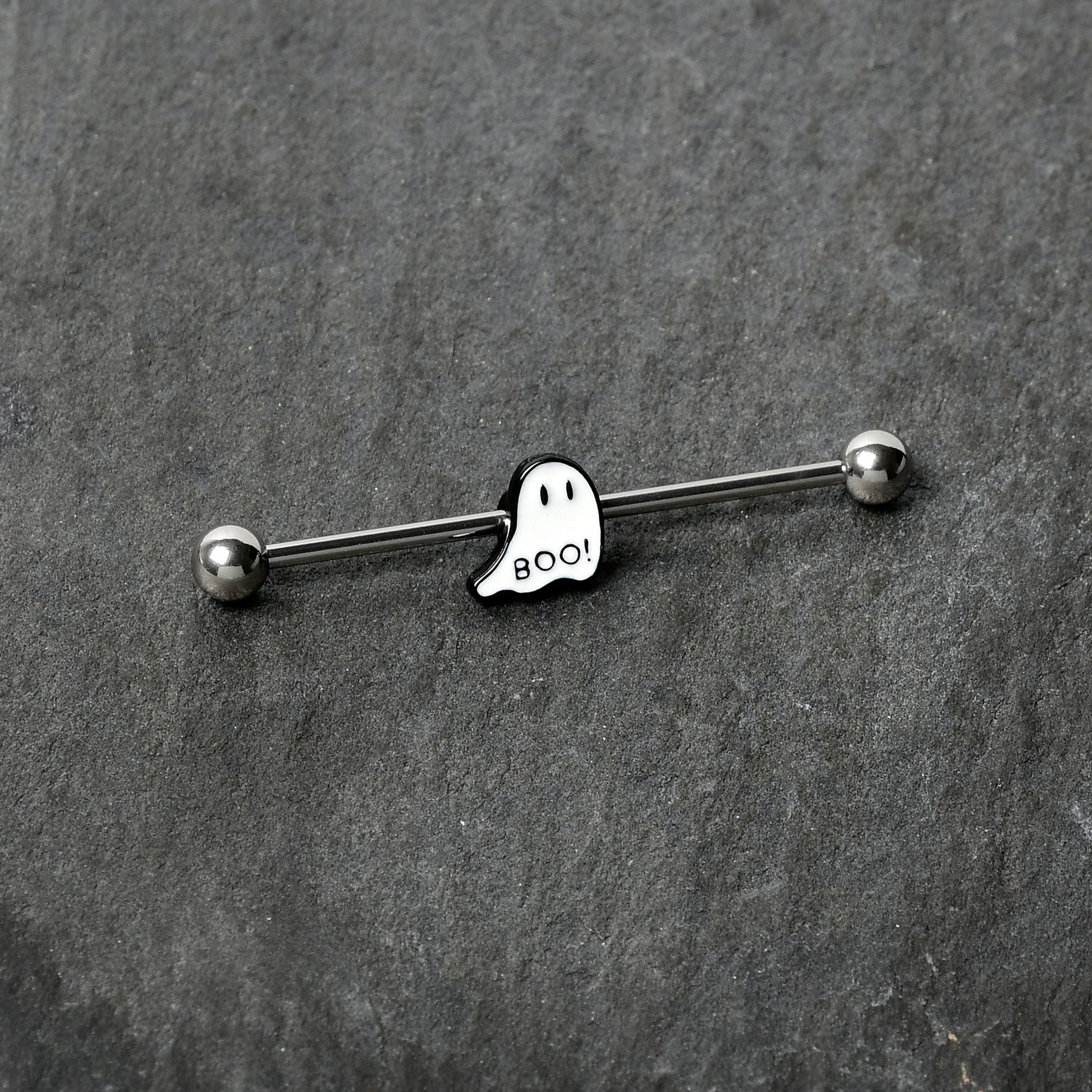Get a look that's as haunting in the dark as it is in the light with this 14 gauge helix barbell! It's made with a 1 1/2" durable 316L surgical grade stainless steel straight barbell with 5mm ball ends. It features a white ghost charm, with black eyes and the word "boo!" on its bottom! The ghost glows when the lights go out for a creepy cute look you'll love! You can even slide it up and down the length of the barbell for the perfect look! Your industrial piercing will have a whole new glow about it with this hauntingly charming Halloween barbell earring.Specifications