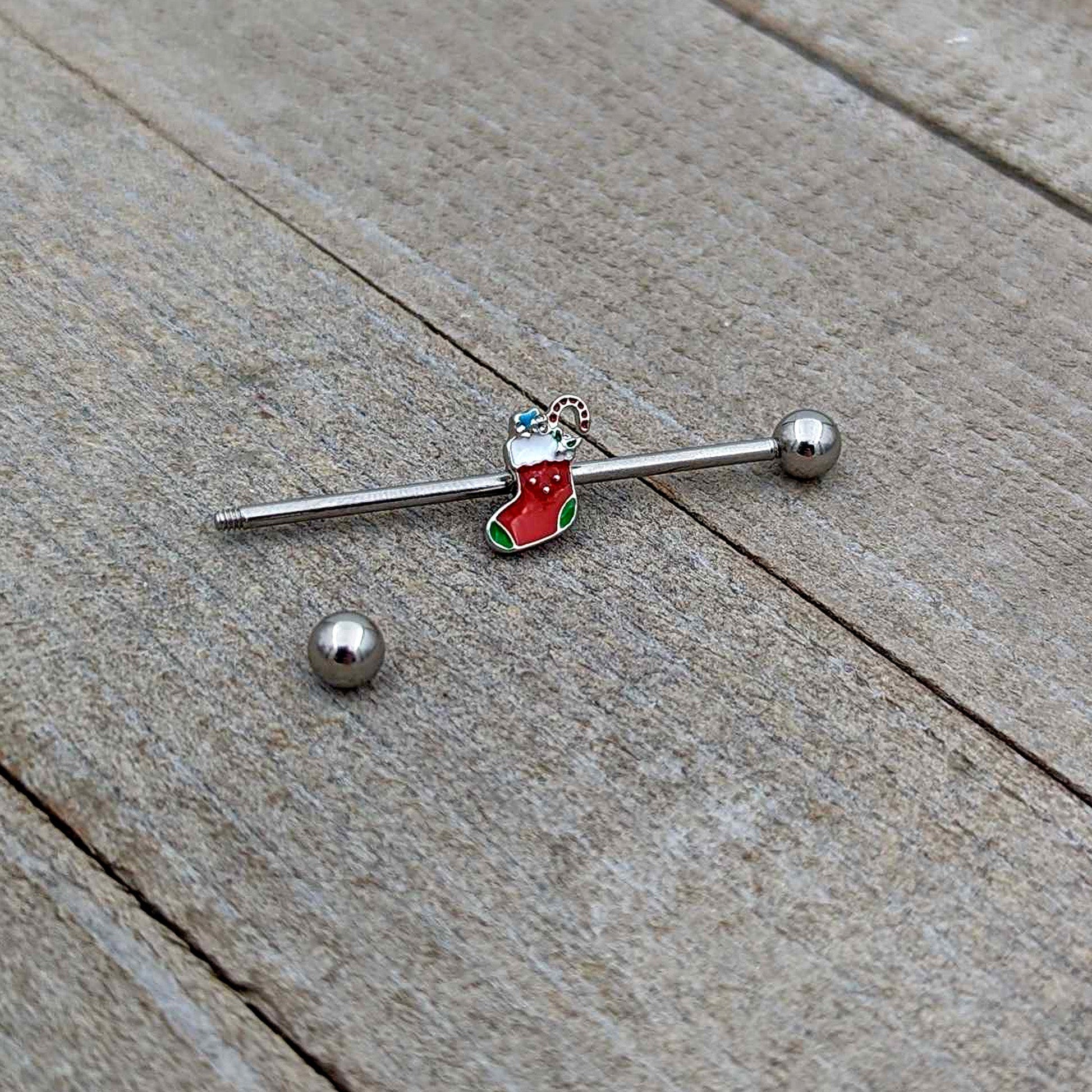 This stocking looks as happy as you'll be when you're rocking this 14 gauge helix barbell! It's made with a 1 1/2" durable 316L surgical grade stainless steel straight barbell with 5mm ball ends. It features a Christmas stocking charm, inlaid in red and green. The stocking features a candy cane and gift embellishments at the top and a tiny little face below the cuff. You can even slide it up and down the length of the barbell for the perfect look. This stocking is sure to make you smile back when you're rocking this festive, holiday barbell earring!Specifications