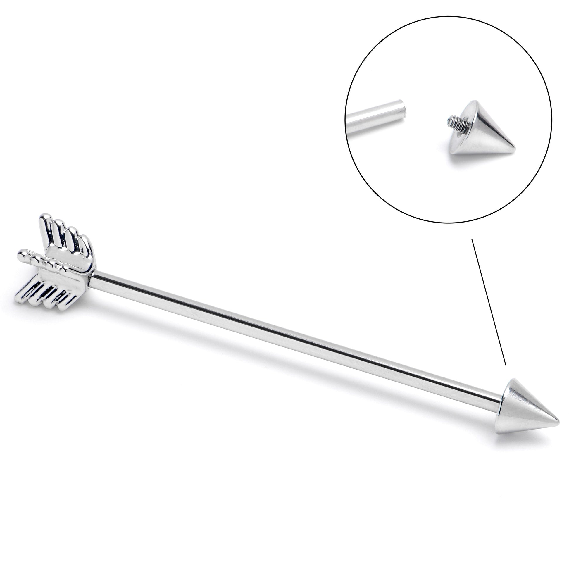 Cupid's arrow is heading your way to make you fall in love with this 14 gauge helix barbell. It is made with a 1 1/2 inch durable 316L surgical grade stainless steel straight barbell. The ends are the head and tail feathers of the arrow, giving it a touch of realism as it emerges from your piercing. It also features an internally threaded design for maximum comfort on insertion and removal. Even if cupid's arrows have missed you in the past, this barbell earring is sure to be a hit.Specifications
