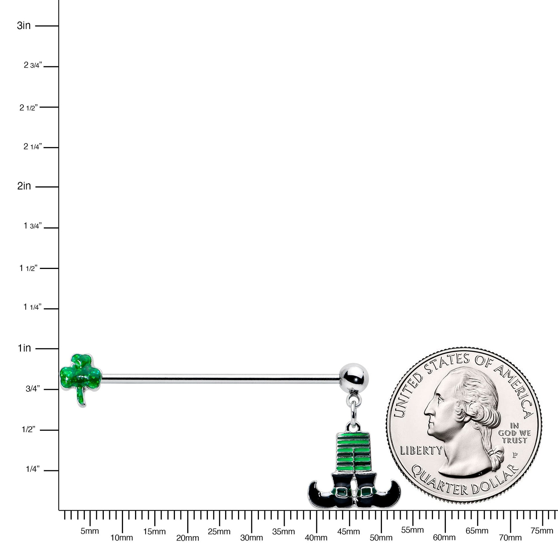 Give your piercing a new set of legs with this 14 gauge helix barbell! It's made with a 1 1/2" durable 316L surgical grade stainless steel straight barbell with a shamrock charm end. The other end is a 5mm ball end and features a dangling leprechaun charm, showing the leprechaun's striped green and black socks and black curving boots for a charmingly traditional look. You'll have all the luck you need when you're rocking this St Patrick's Day themed barbell earring!Specifications