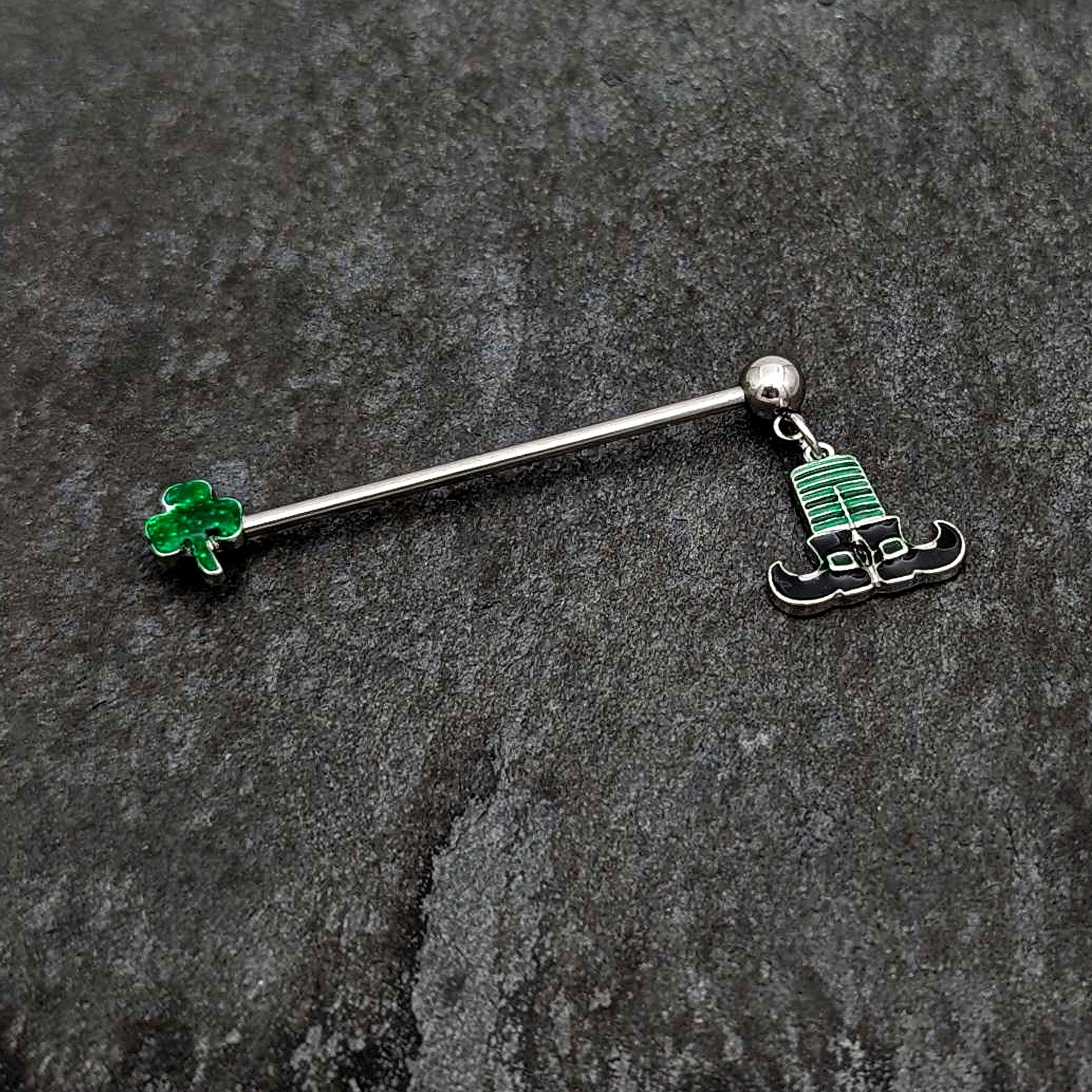14 Gauge Leprechaun Legs Shamrock Dangle Industrial Barbell 38mm