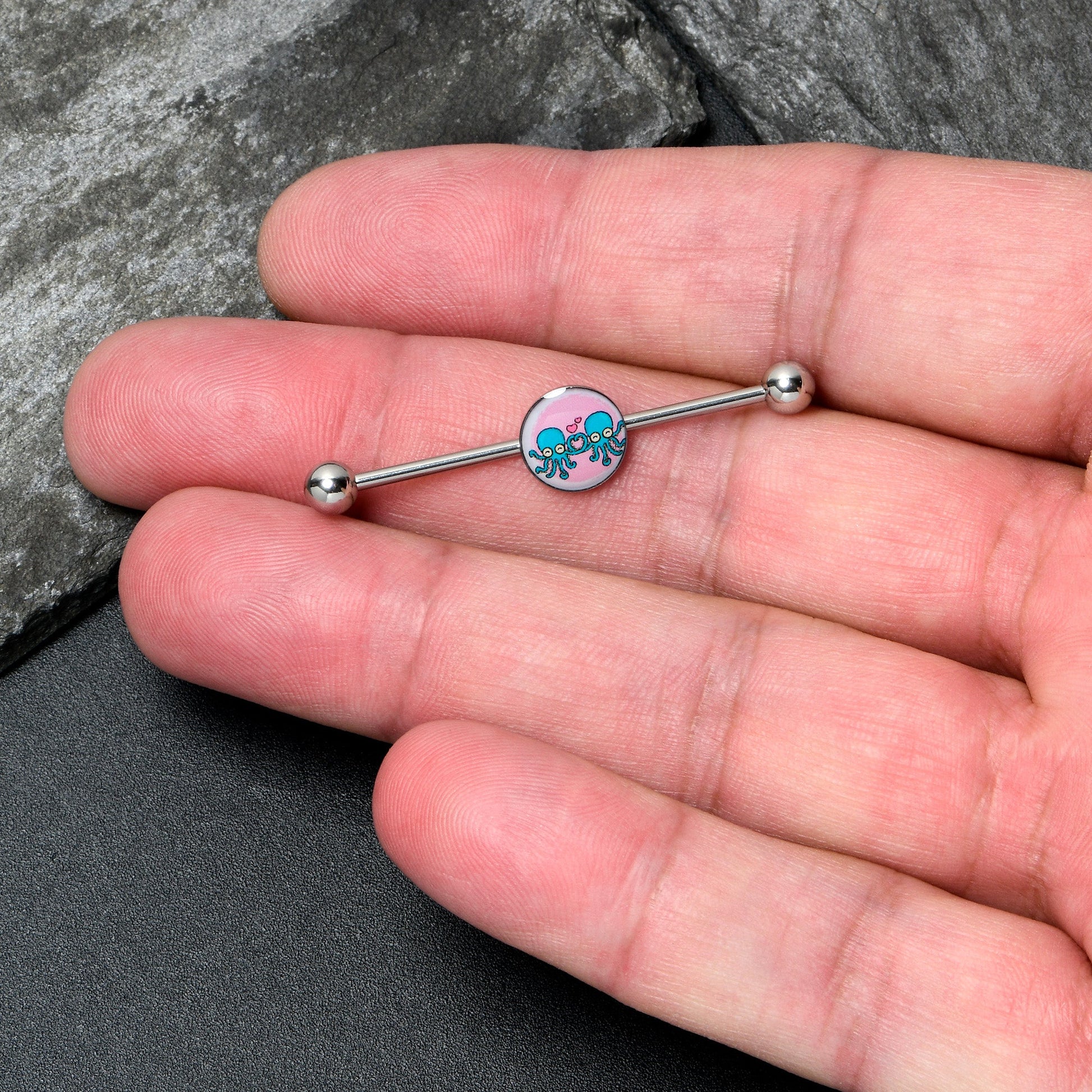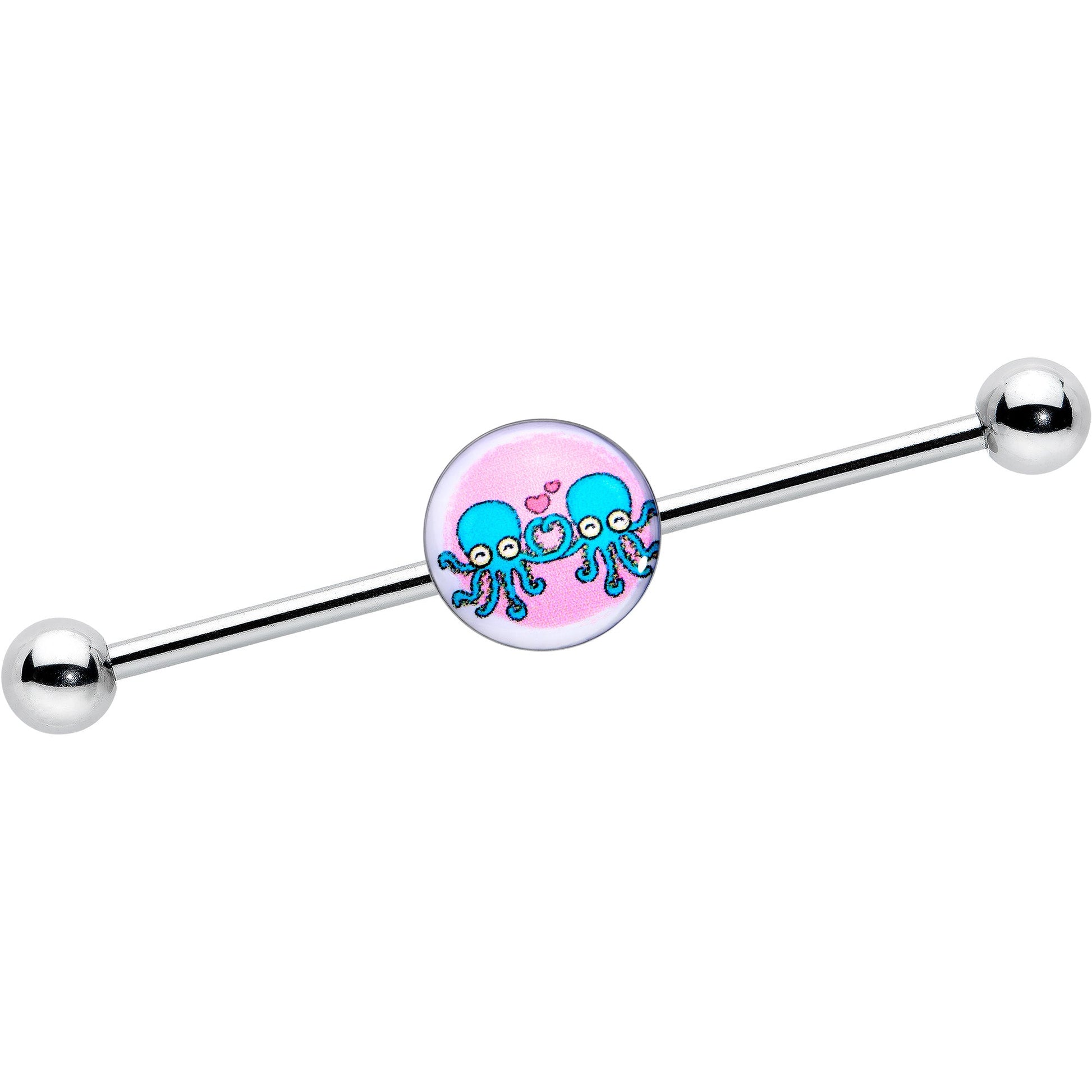 Feel the love with your heart, or with all eight legs when you are rocking this 14 gauge helix barbell. It is made with a 1 1/2 inch 316L surgical grade stainless steel straight barbell with 5mm ball ends. It features a pink disc charm that show a pair of blue octopi, embellished with a deep pink heart above them. You can slide these cephalopods up and down the length of the barbell for the perfect look. Let love take you in its tentacles with this awesome octopus barbell earring.Specifications