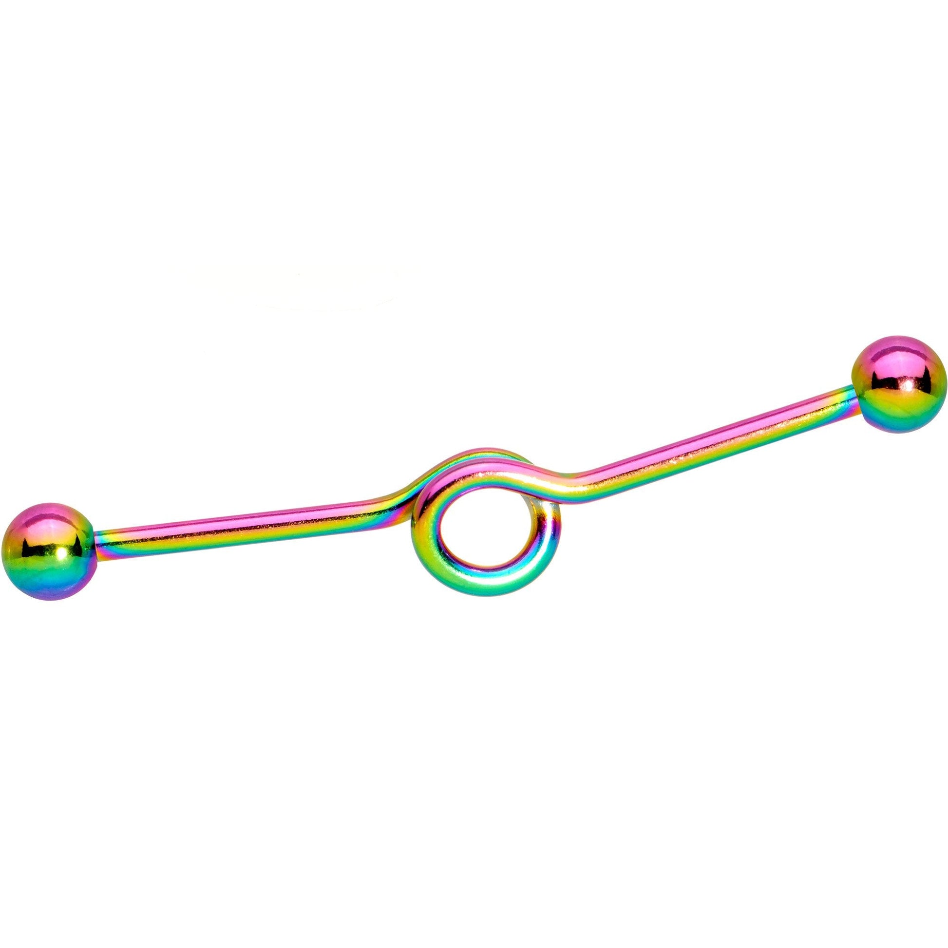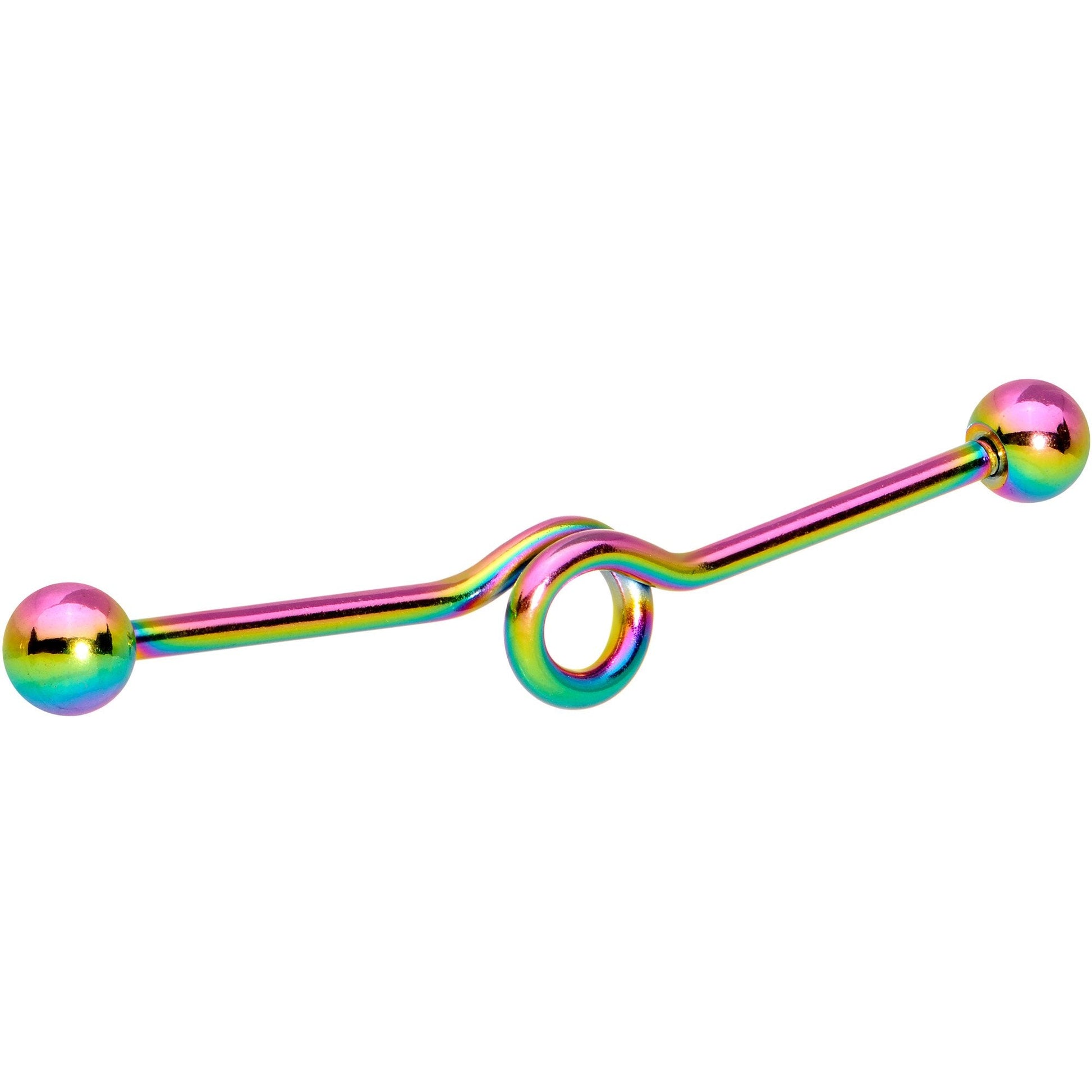 Looking for a variety of twisted industrial barbells? Then this pack of five 14 gauge multi color industrial barbells with a twist design is exactly what you need for a pierced look you can be proud of. The pack comes with a 316L surgical grade stainless steel industrial barbell, a rainbow anodized titanium industrial barbell, a black anodized titanium industrial barbell, a blue anodized industrial barbell, and a gold tone anodized industrial barbell. Each industrial piercing is 1 9/16" in length. Great for a new look every day!