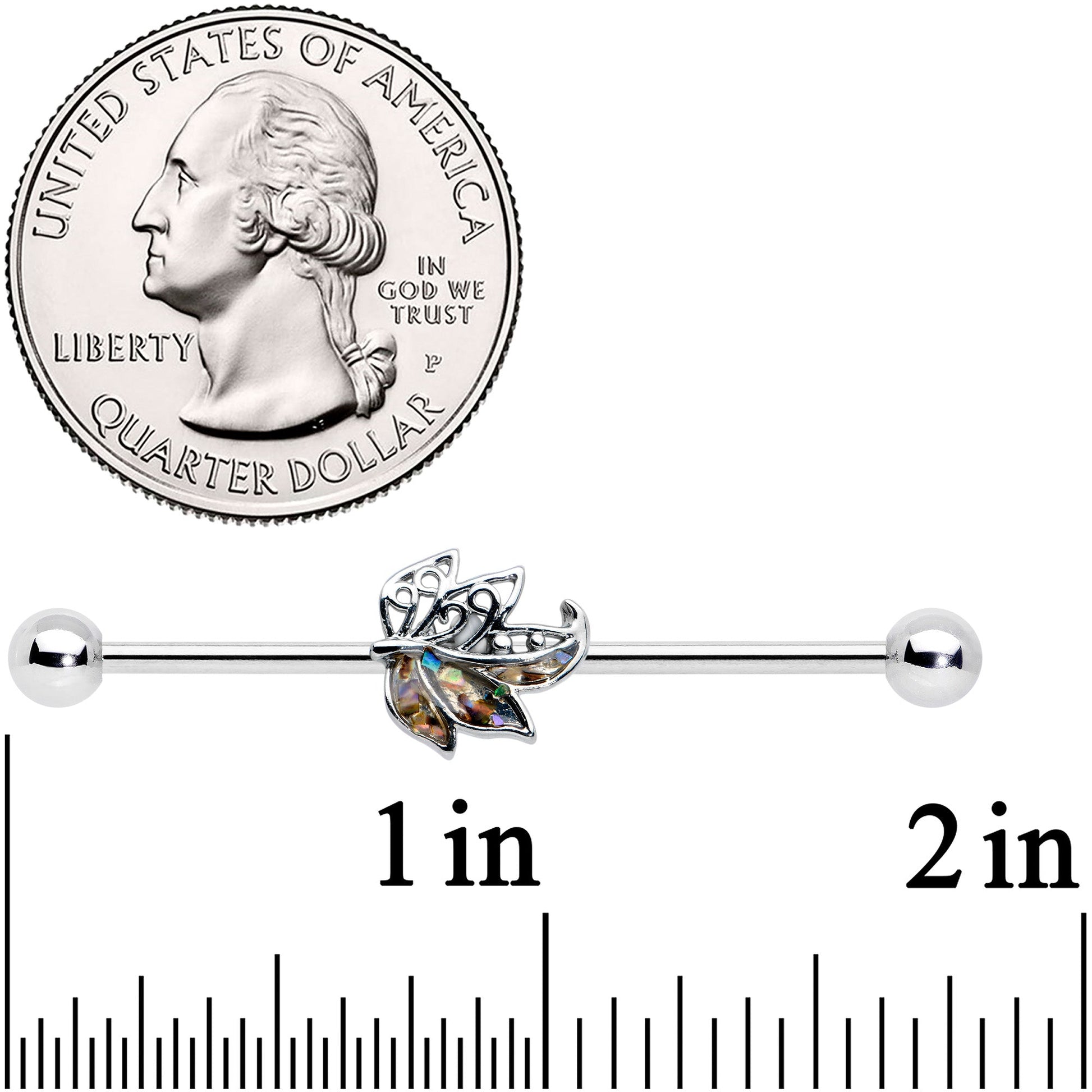 You can have all the colors of the changing leaves in your industrial piercing with this 14 gauge helix barbell! It's made with a 1 1/2" durable 316L surgical grade stainless steel straight barbell with 5mm ball ends. It features an Autumn leaf charm, with one half of it in elegant openwork. The other side of the leaf is inlaid in all the colors of Fall. You can evenn slide the charm up and down the length of the barbell for the perfect look! Fall in love with this elegant Autumn barbell earring!Specifications