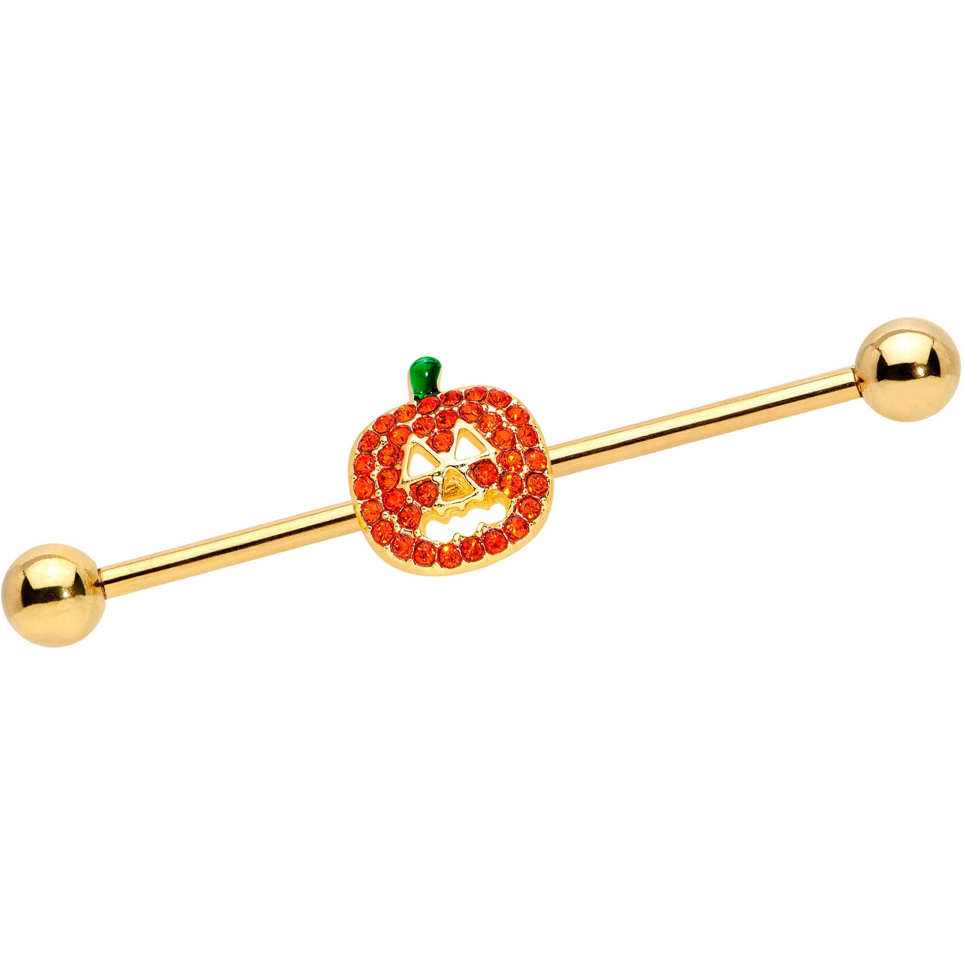 14G Orange Gem Gold Tone Jack O Lantern Industrial Barbell 38mm