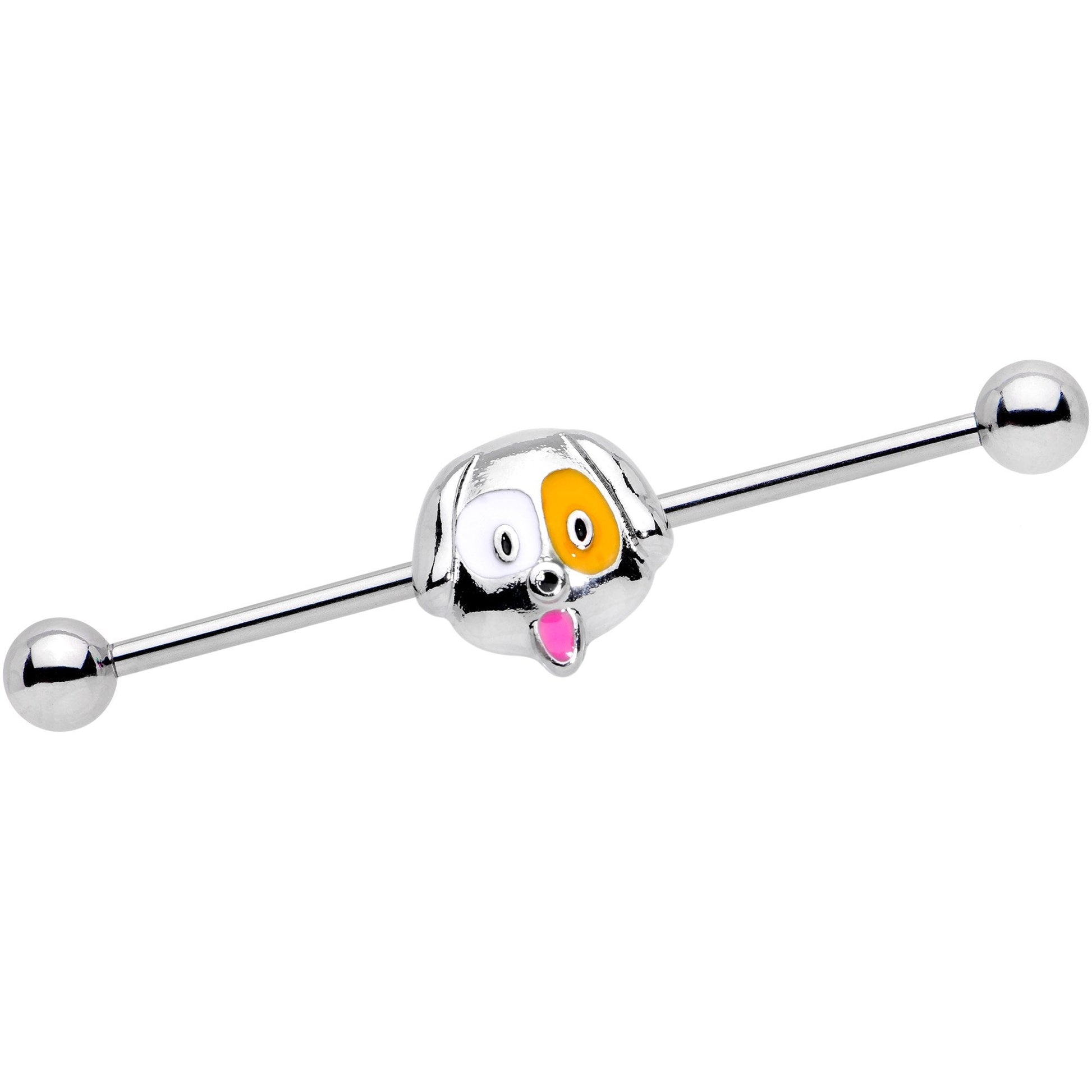 If puppies are your best friends, then this pooch themed 14 gauge industrial barbell is perfect for you! With white and orange eyes and pink tongue flopping out, this puppy is the cutest. The moveable metalwork puppy charm is set on a 1 1/2" length straight barbell made with durable 316L surgical grade stainless steel. Puppy lovers line up!