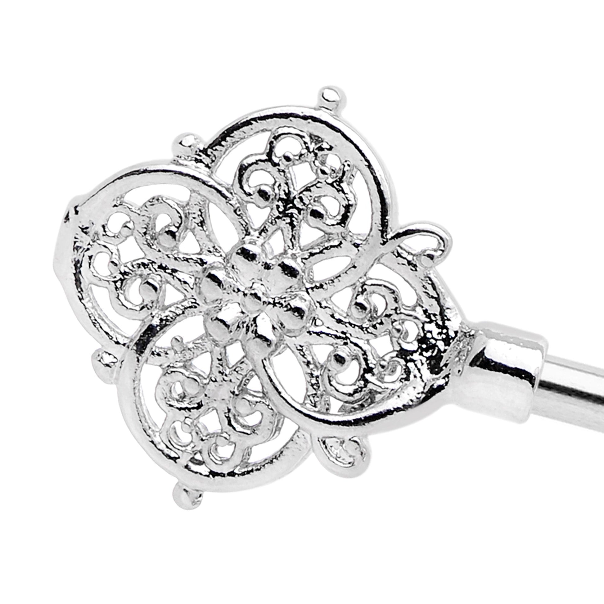 This 14 gauge barbell industrial has a delicate look that's so light and airy you won't be able to resist.....but don't be fooled! It's made with a 1 1/2" durable 316L surgical grade stainless steel straight barbell. One end is the key's bow with interlacing filigree swirls for a graceful appearance. The other end is the key's bit, with a simple barrel shape and openwork oblong embellishment. This helix barbell is sure to unlock the power of your piercing!Specifications