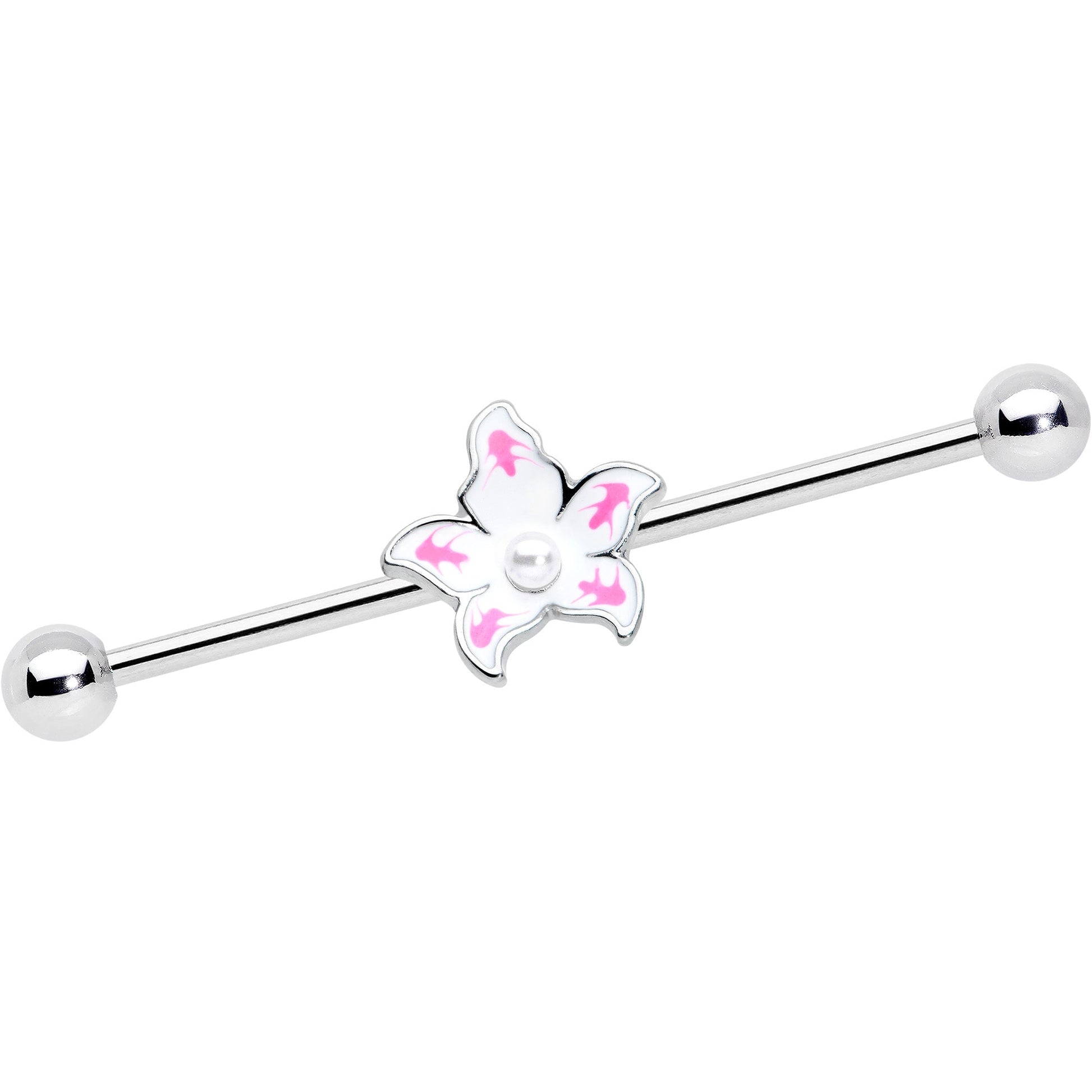 14 Gauge Pearly White Orb Pink Flower Industrial Barbell 38mm