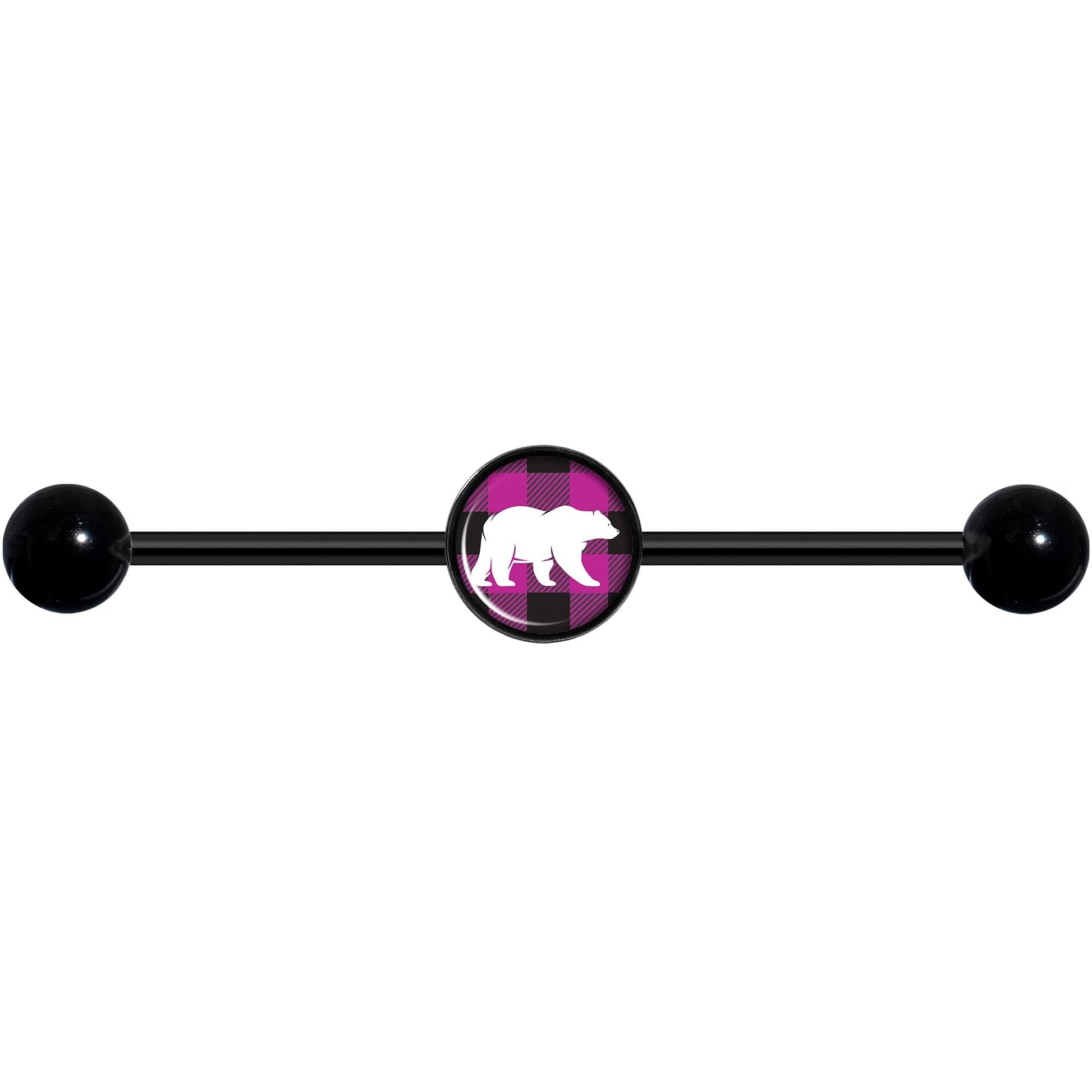 ,14 Gauge Pink Black Plaid Polar Bear Black Industrial Barbell 37mm