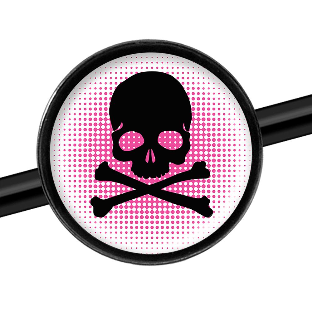 If you love the color pink and scary Halloween skull and crossbones then this 14 gauge industrial earring is right for you! Made with a 1.45" black anodized over 316L surgical grade stainless steel straight barbell, this straight barbell jewelry features a nonmoving logo inlay charm and 6mm ball ends.