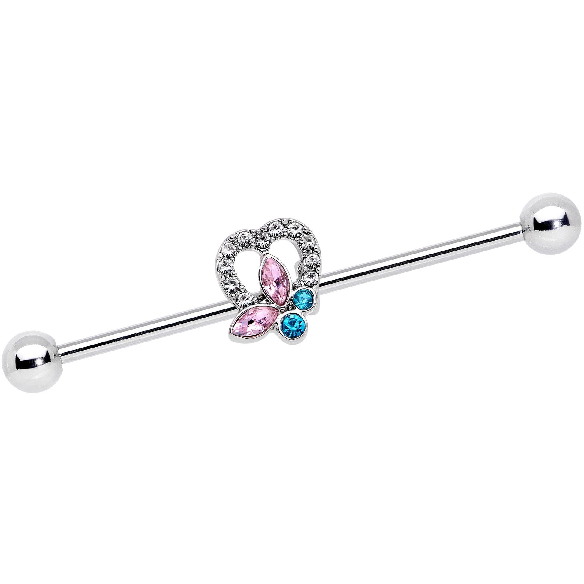 Get ready to fall in love with spring every time you wear this pretty 14 gauge industrial earring. Made with a 1 1/2" durable 316L surgical grade stainless steel straight barbell, this industrial jewelry features a moveable heart charm with clear gems that is set with a butterfly, formed with pink and blue gems.