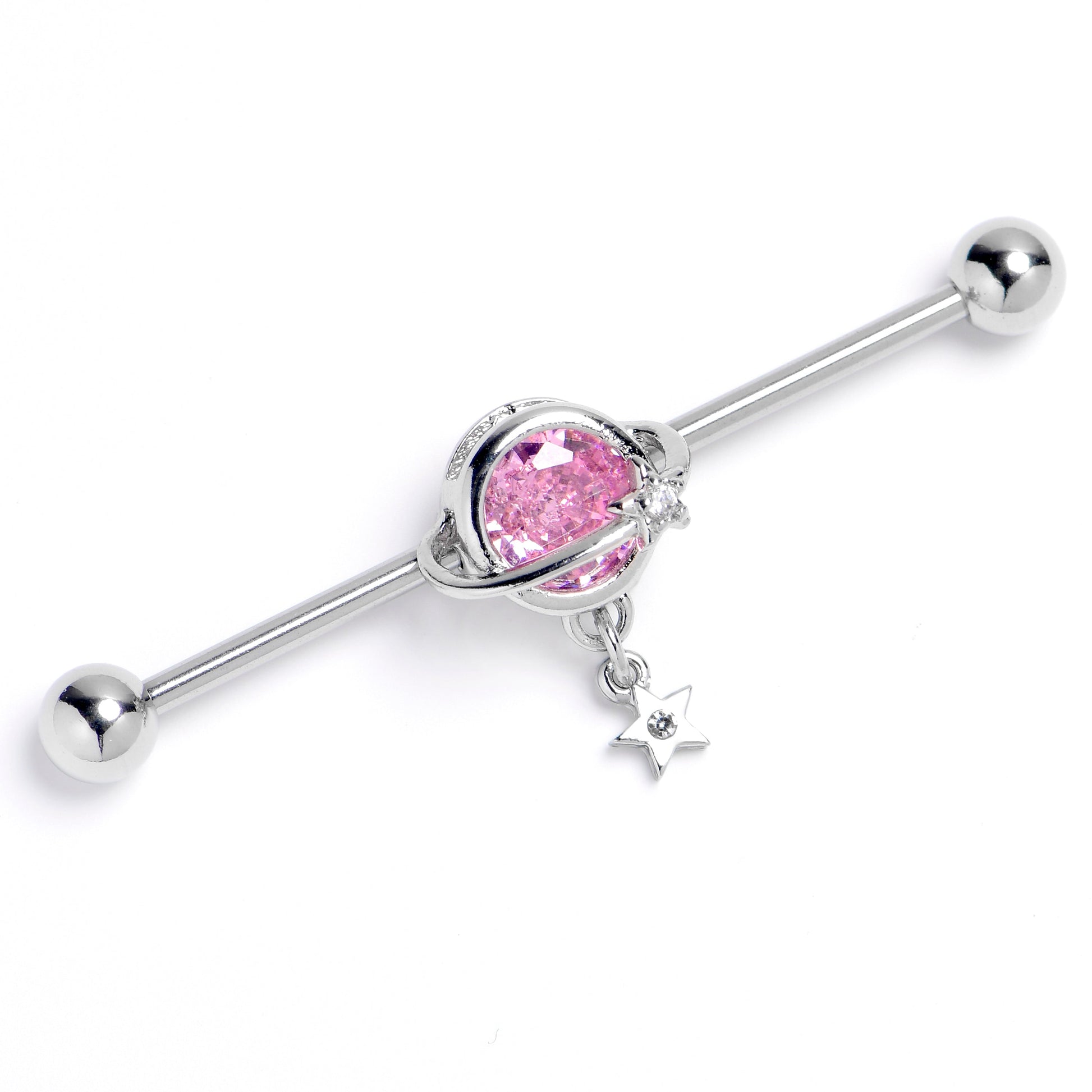 14 Gauge Pink Clear Gem Starry Saturn Dangle Industrial Barbell 38mm