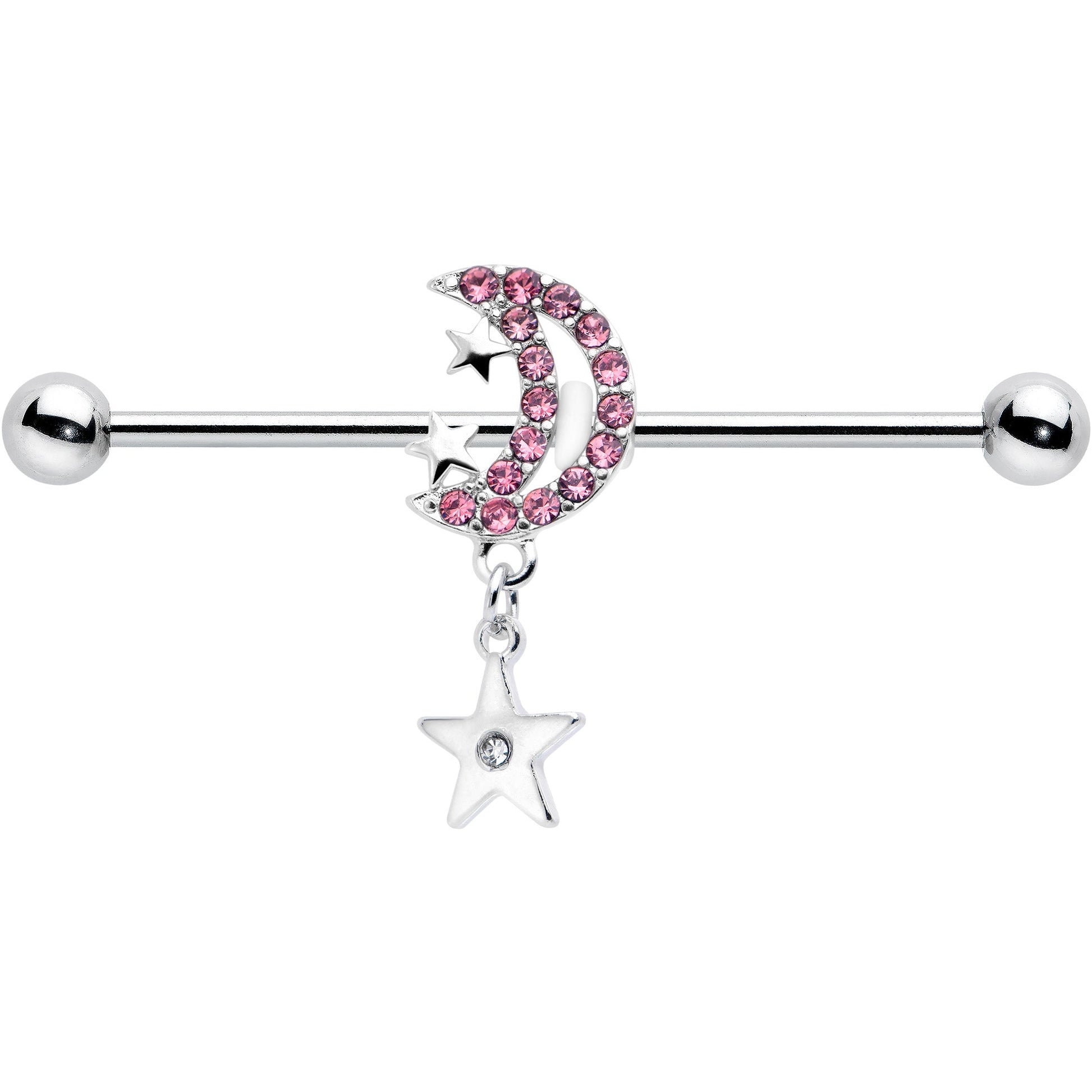 14 Gauge Pink CZ Gem Moon Dangle Star Industrial Barbell 38mm